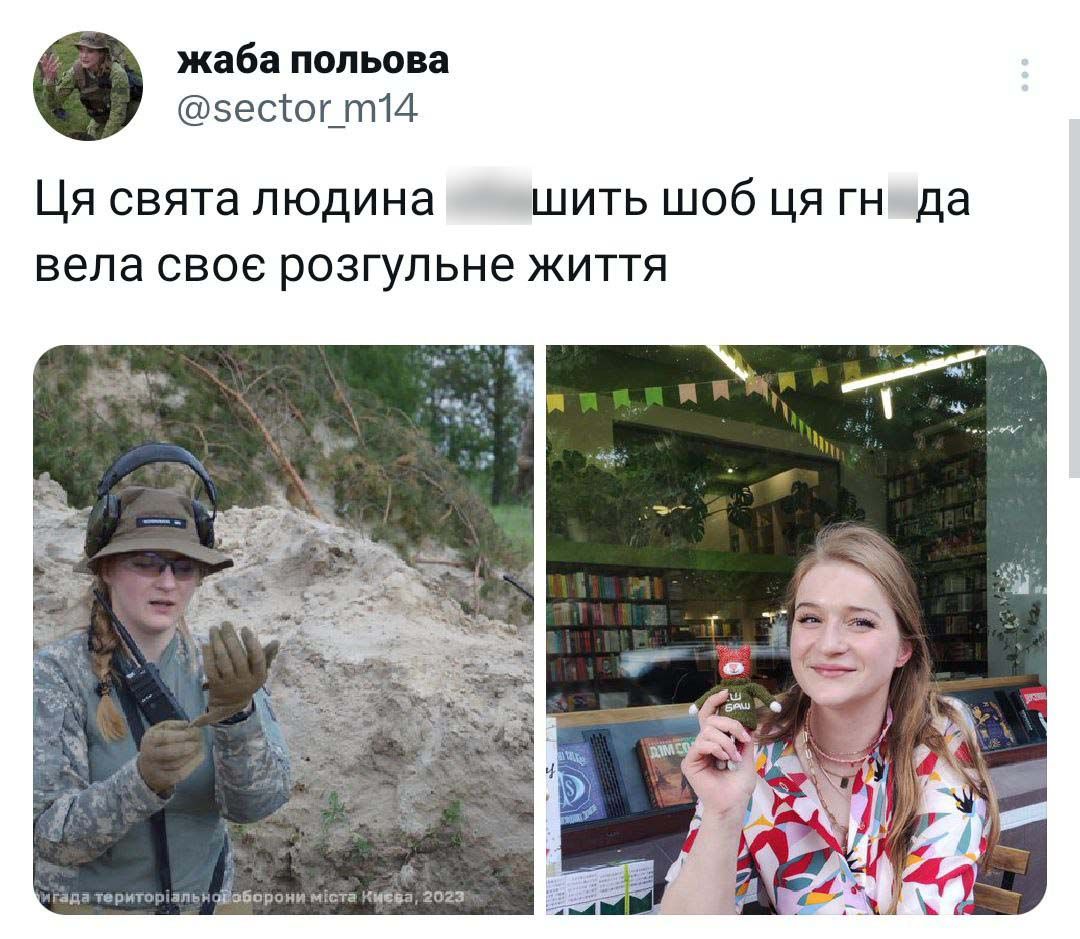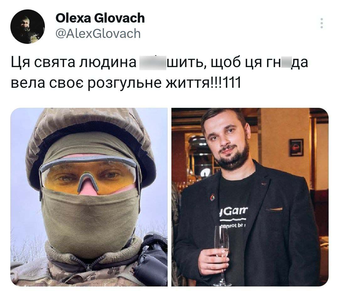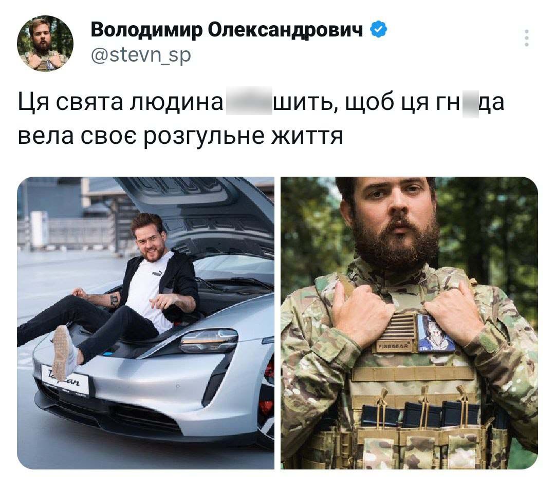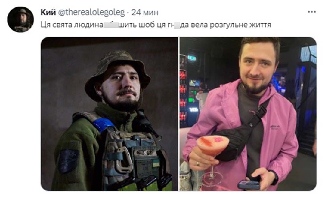 "Этот святой человек пошел на свою вторую войну, чтобы эта гн*да жила свою роскошную жизнь", – написал военный, являющийся киевским бизнесменом и маркетологом.