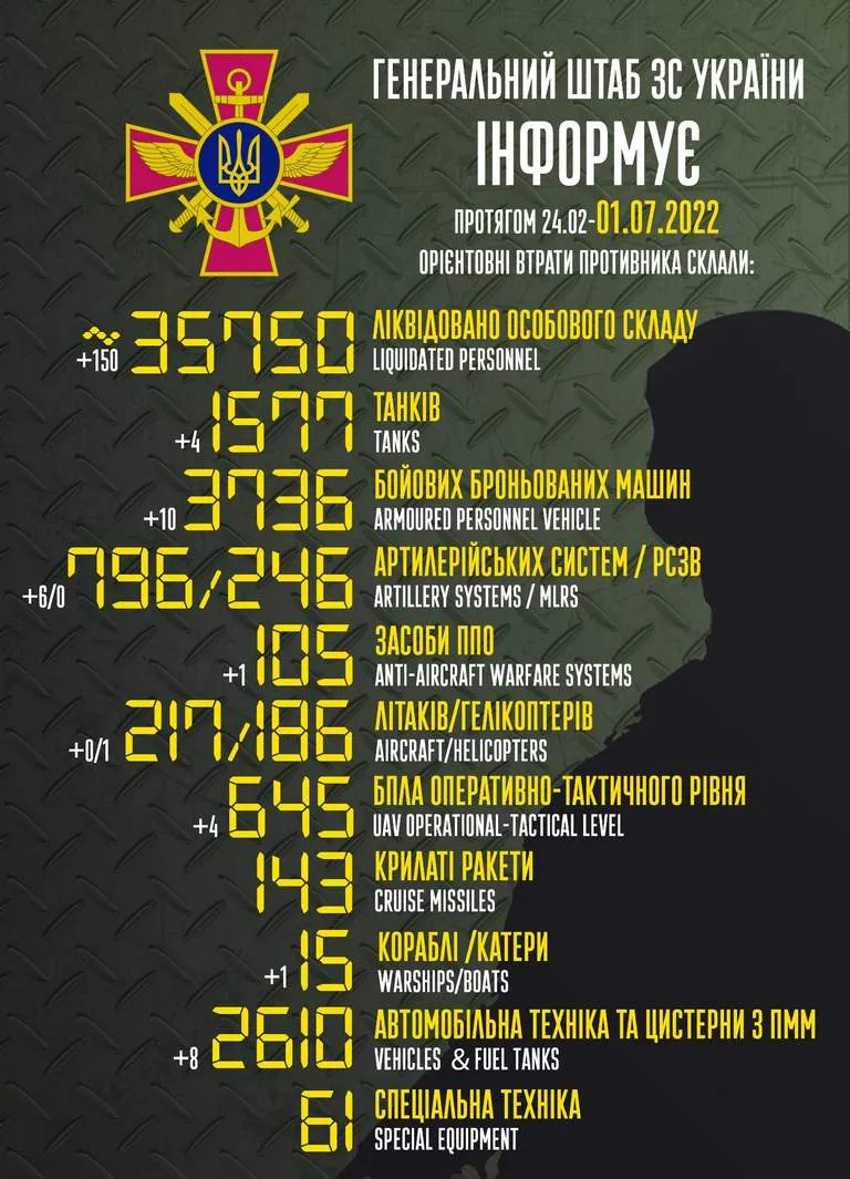 На утро 1 июля украинские защитники уничтожили уже ориентировочно 35 750 российских захватчиков с начала полномасштабной войны. Только за последние сутки их количество увеличилось на 150 "асвободителей".