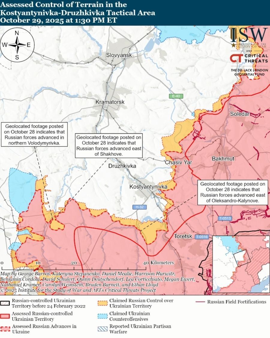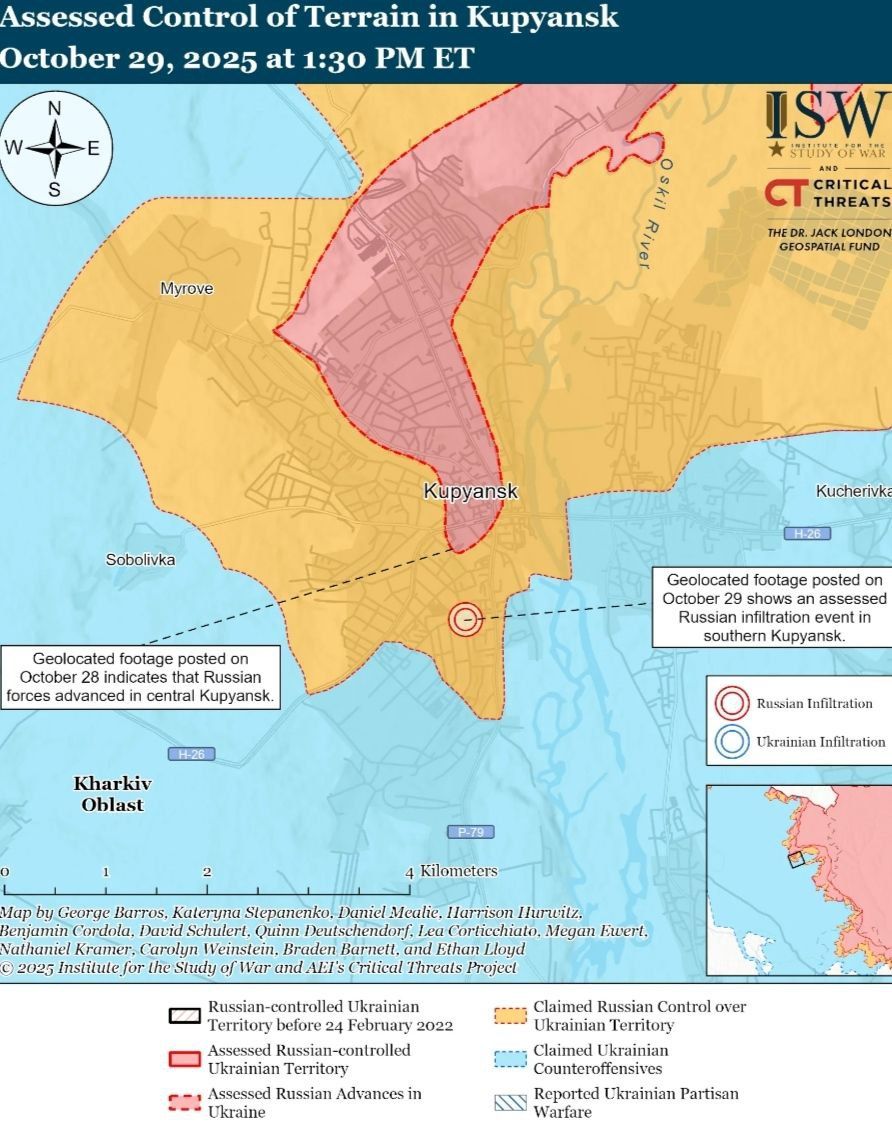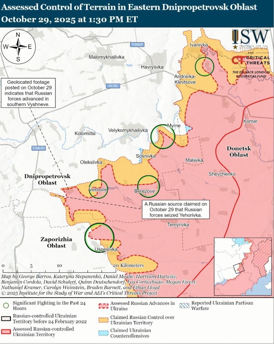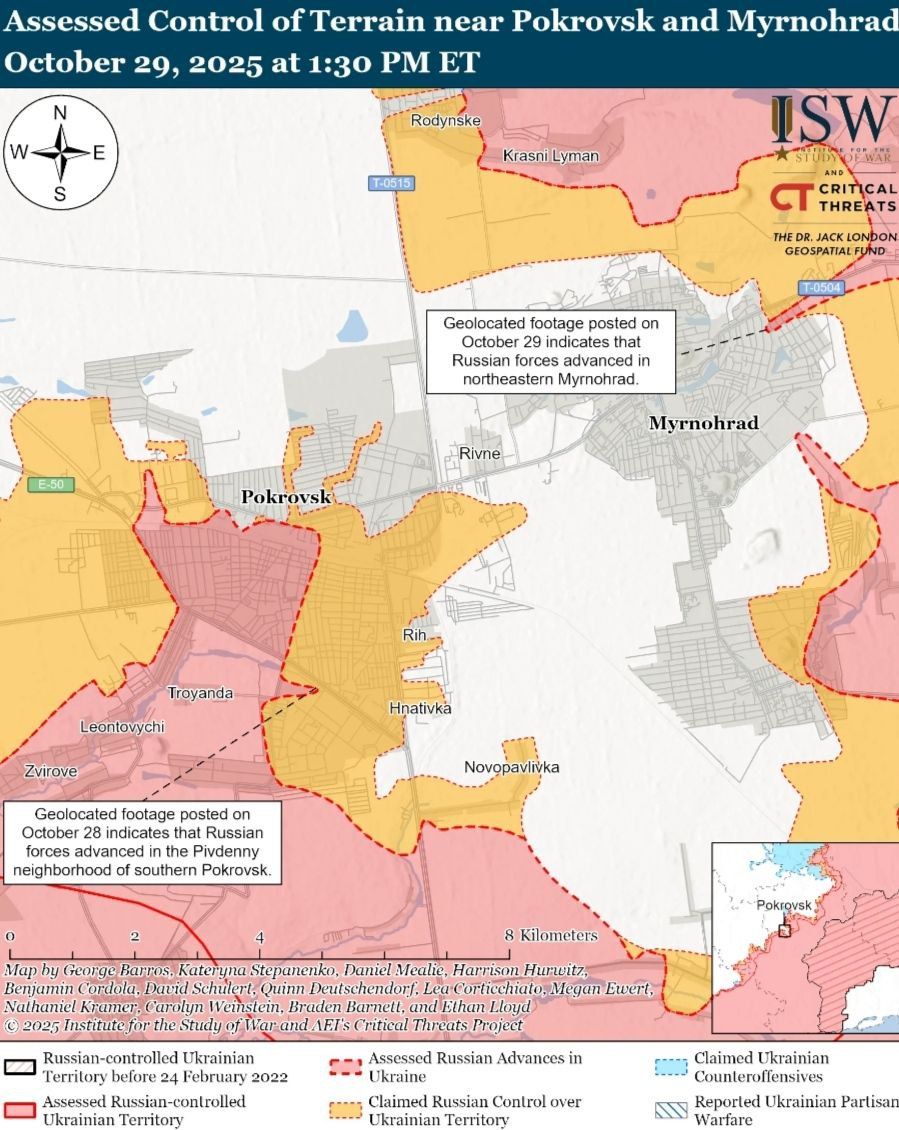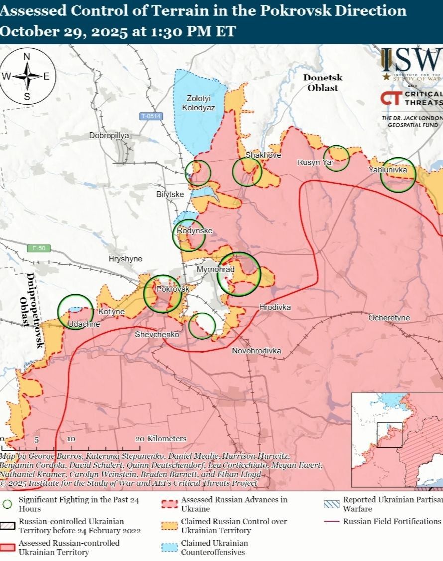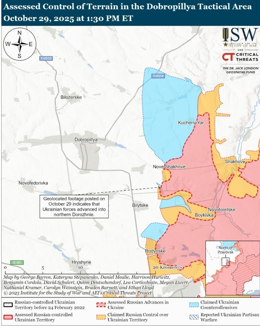 Российские войска имели успехи в направлении Покровска. Украинский 7-й корпус быстрого реагирования Десантно-штурмовых войск (ДШВ) сообщил 29 октября, что российские войска сосредоточили 11 000 личного состава для операции под Покровском и развернули всего 29 000 личного состава в зоне ответственности корпуса.