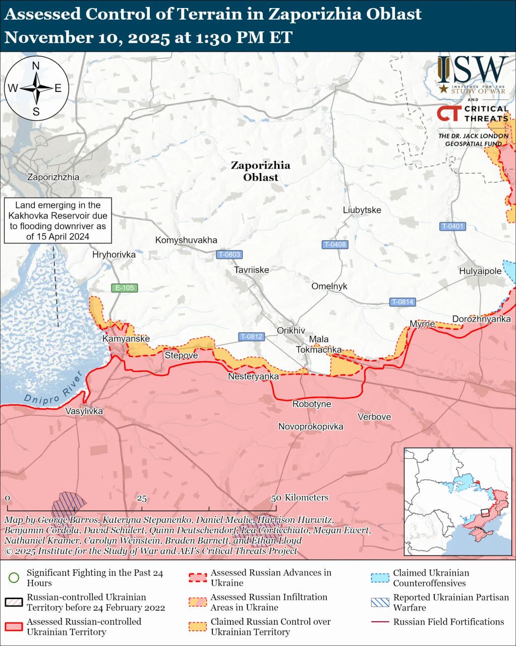 На Ореховском направлении российские войска недавно продвинулись на северо-восток от Гуляйполя, захватив населенный пункт Новое. Также они появились в восточной части Соленого, но без подтверждения изменения линии фронта.