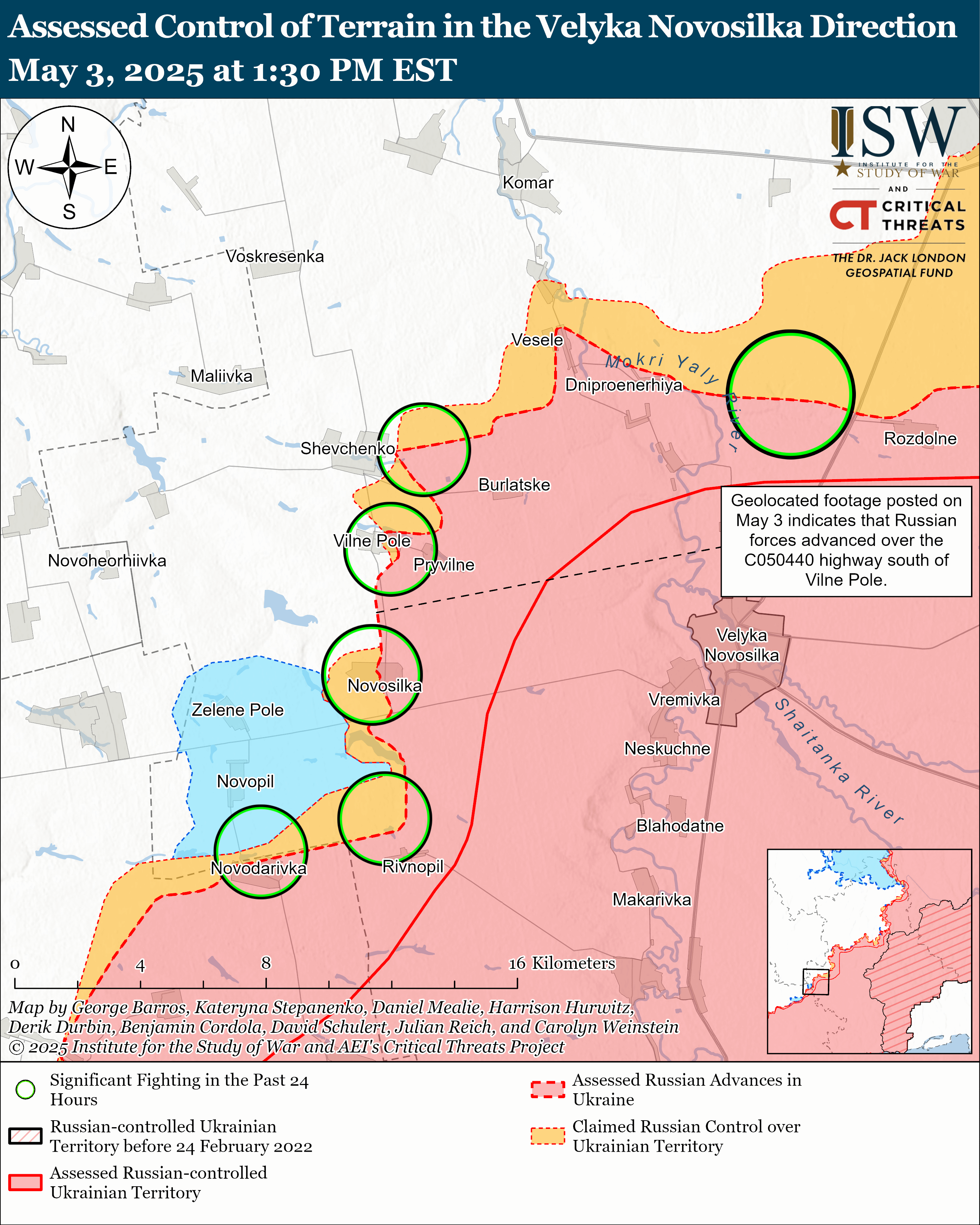 - На юге российские войска провели ограниченные наступательные операции к востоку от Гуляйполя вблизи Высокого. Российские войска продолжили наступательные операции на западе Запорожской области 3 мая, но не продвинулись.