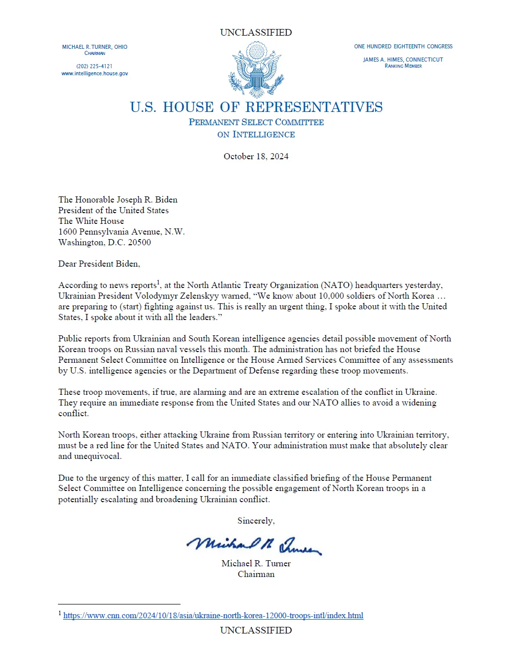 Почему администрация Байдена – Харрис не смогла вовремя проинформировать Конгресс о передвижении северокорейских войск в Россию? Сегодня я направил письмо президенту Байдену с требованием, чтобы его администрация предоставила ответы на вопросы Комитета по вопросам разведки, и чтобы использование северокорейских войск против Украины стало красной линией для США и НАТО,