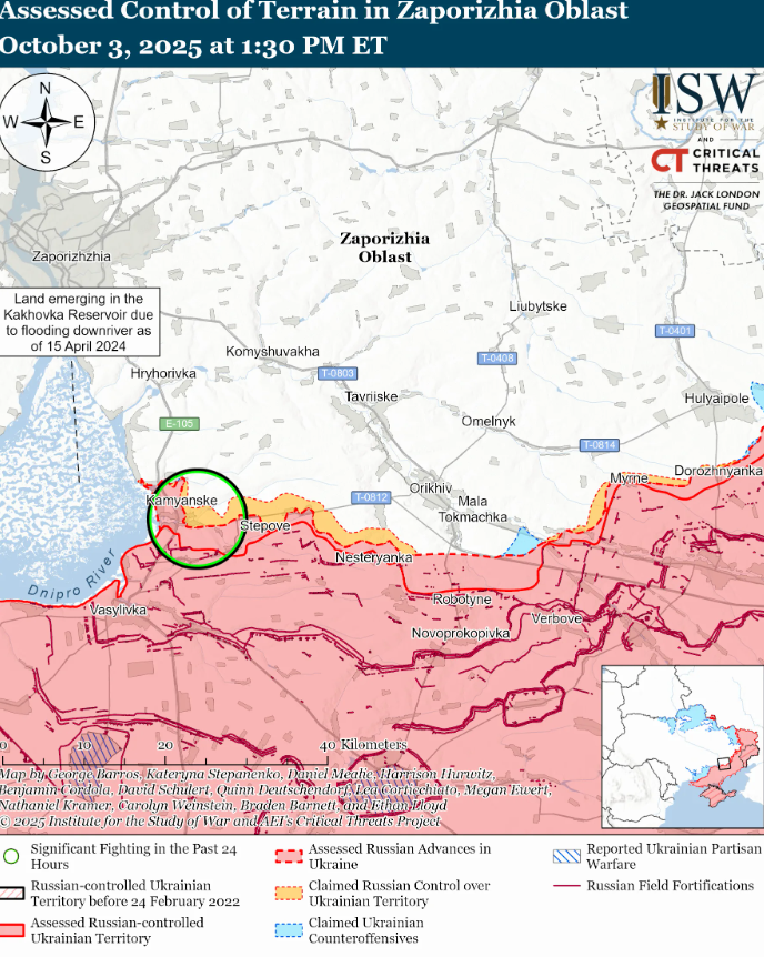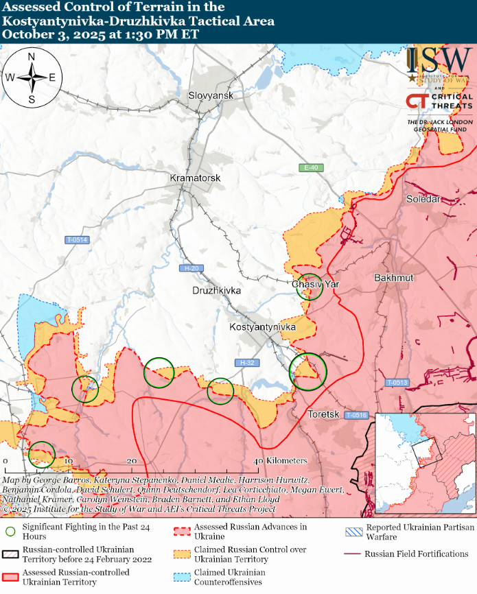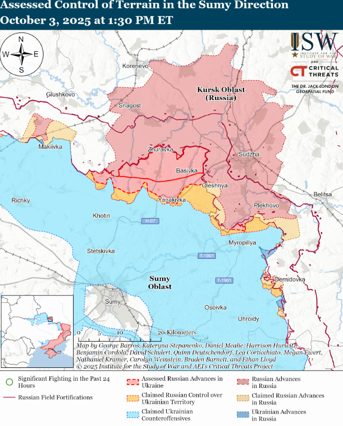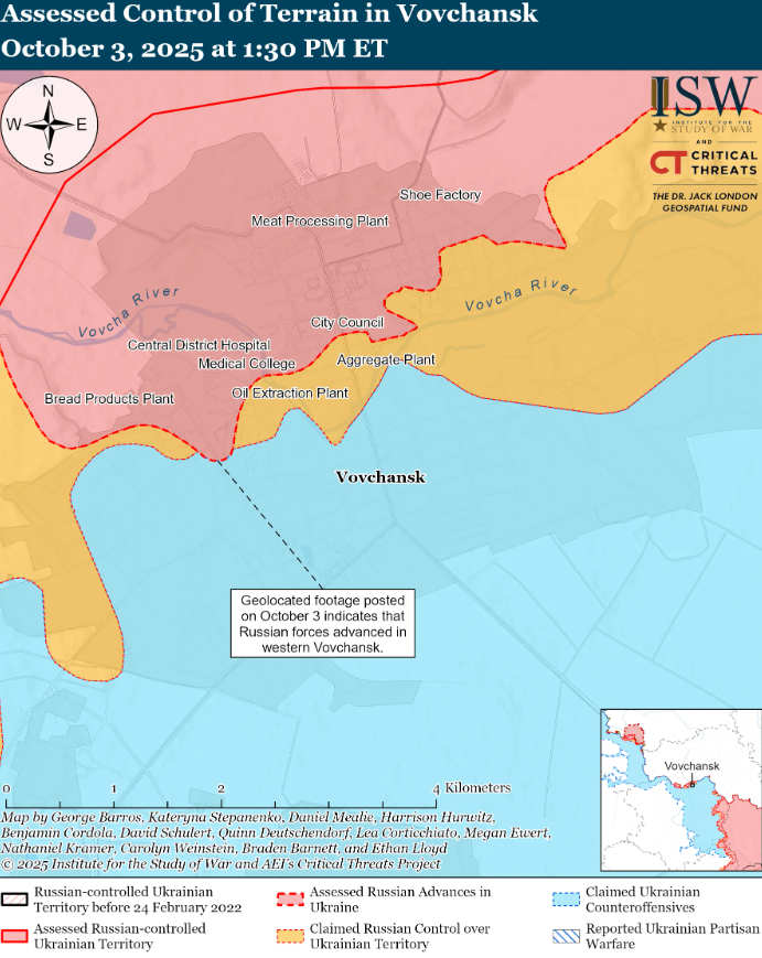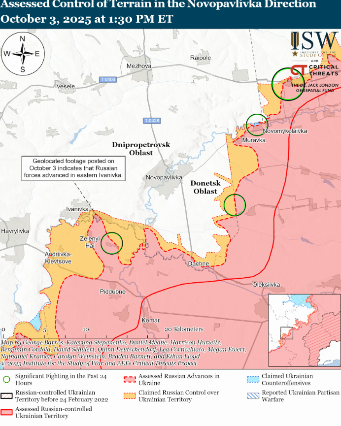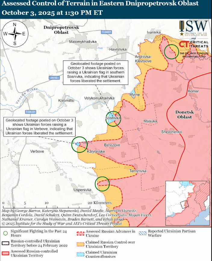 Геолоцированные кадры, опубликованные 3 октября, свидетельствуют, что украинские силы отбили Сосновку (на юго-восток от Великомихайловки) и Вербово (на юго-запад от Великомихайловки).
