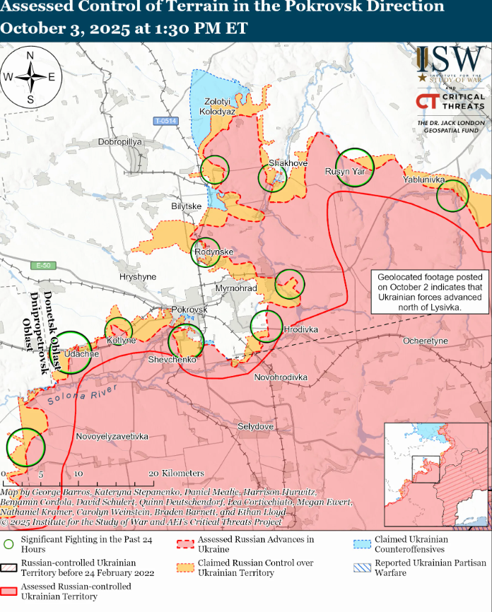 Кроме того, снимки за 3 октября показывают, что украинские силы удерживают позиции или продвинулись в южном Покровске – в районах, которые согласно заявлениям россиян, якобы находятся под их контролем.