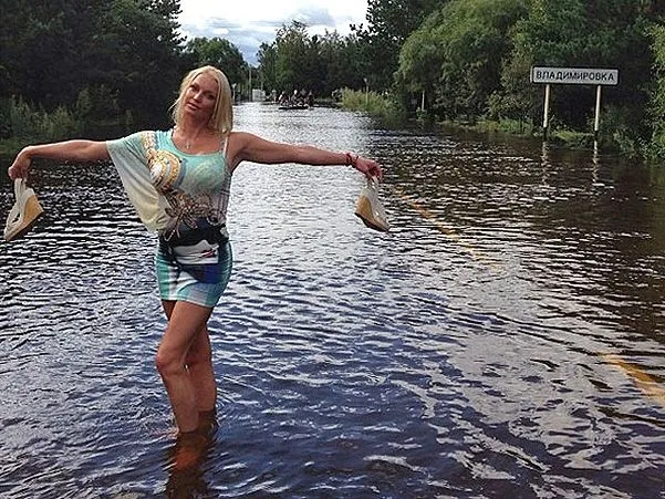 Звезда балета посетила место наводнения для проведения благотворительного концерта. А также Волочкова устроила целую фотосессию в мини-юбке на развалинах поселка.