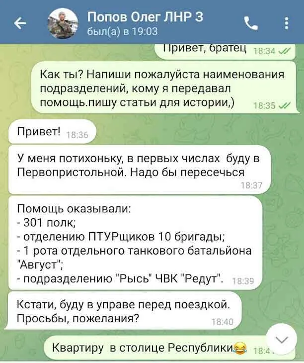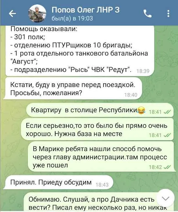 Позже Иванов в переписке с Поповым также в шутку намекать, что ему нужна недвижимость, мол, в "Марику" процесс уже пошел через "администрацию". Получил ли "волонтер" квартиру в Луганске – неизвестно, ведь Попова ликвидировали в декабре 2023 года.