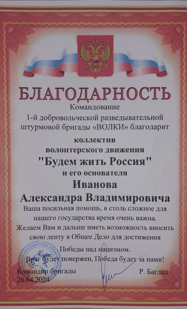 Для справки. "Будем жить Россия" – это организация Иванова, которая собирает средства на поддержку оккупантов.