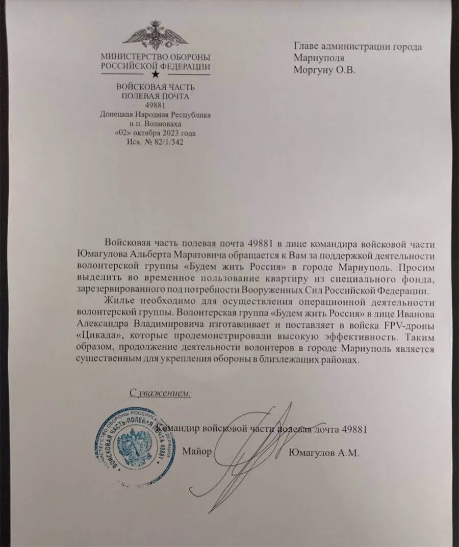 Впрочем, за этим всем Иванов скрывал истинную цель своих визитов. Среди документов, которые нашли расследователи, есть письмо от командира воинской части 49881 в адрес руководства оккупационной администрации Мариуполя с просьбой выделить квартиру в городе волонтерской организации "Будем жить Россия".