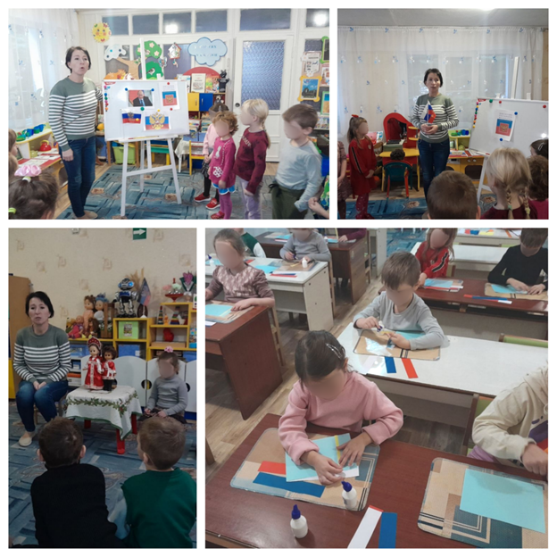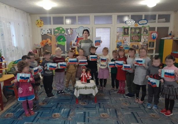 Она ознакомила детей с основными конституционными положениями России, рассказала им сказку "Страна Можно и страна Нельзя" о значимости конституции страны-агрессорки и показала воспитанникам российскую государственную символику. Кроме этого коллаборантка заставила малышей делать аппликации с флагом государства-террориста.