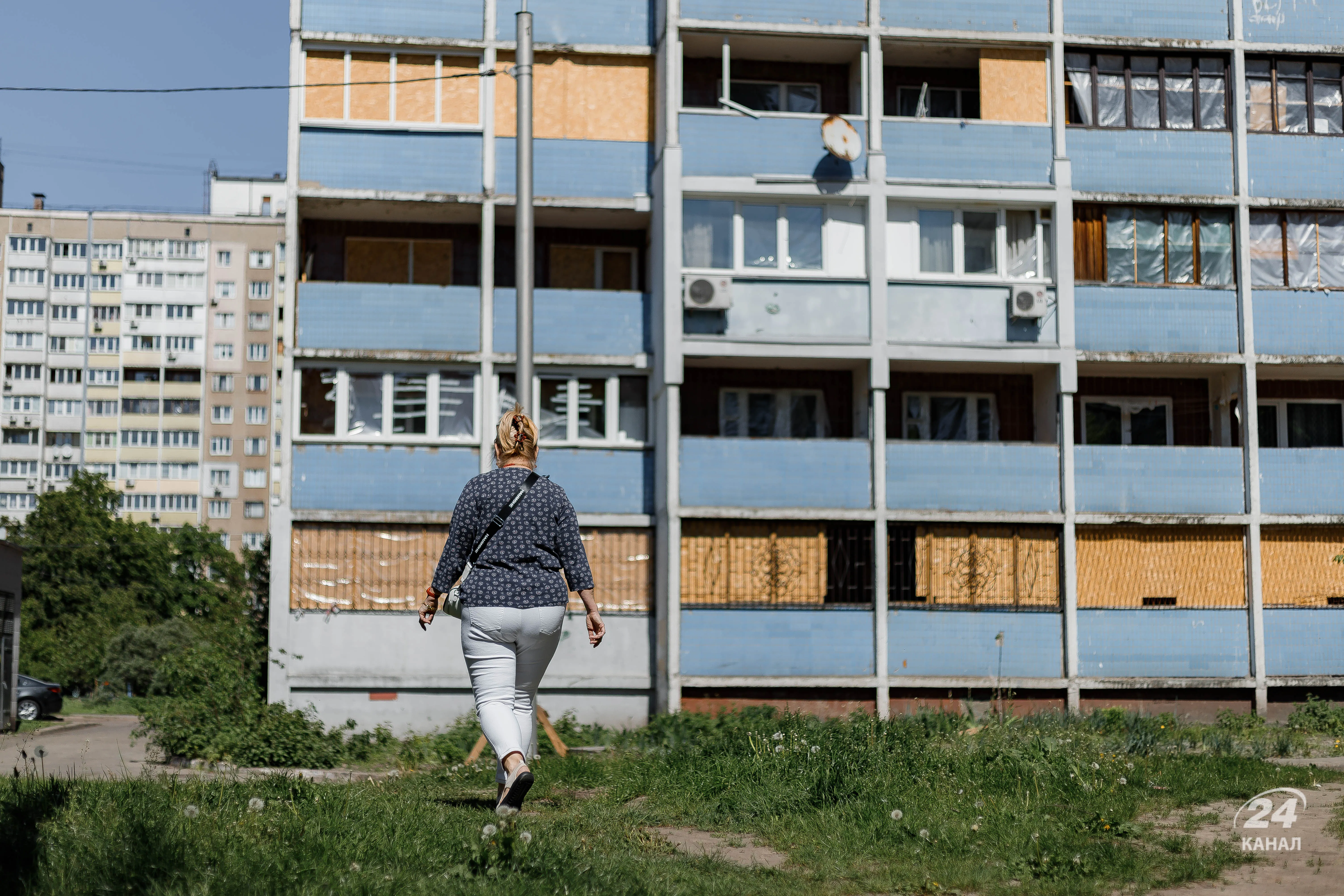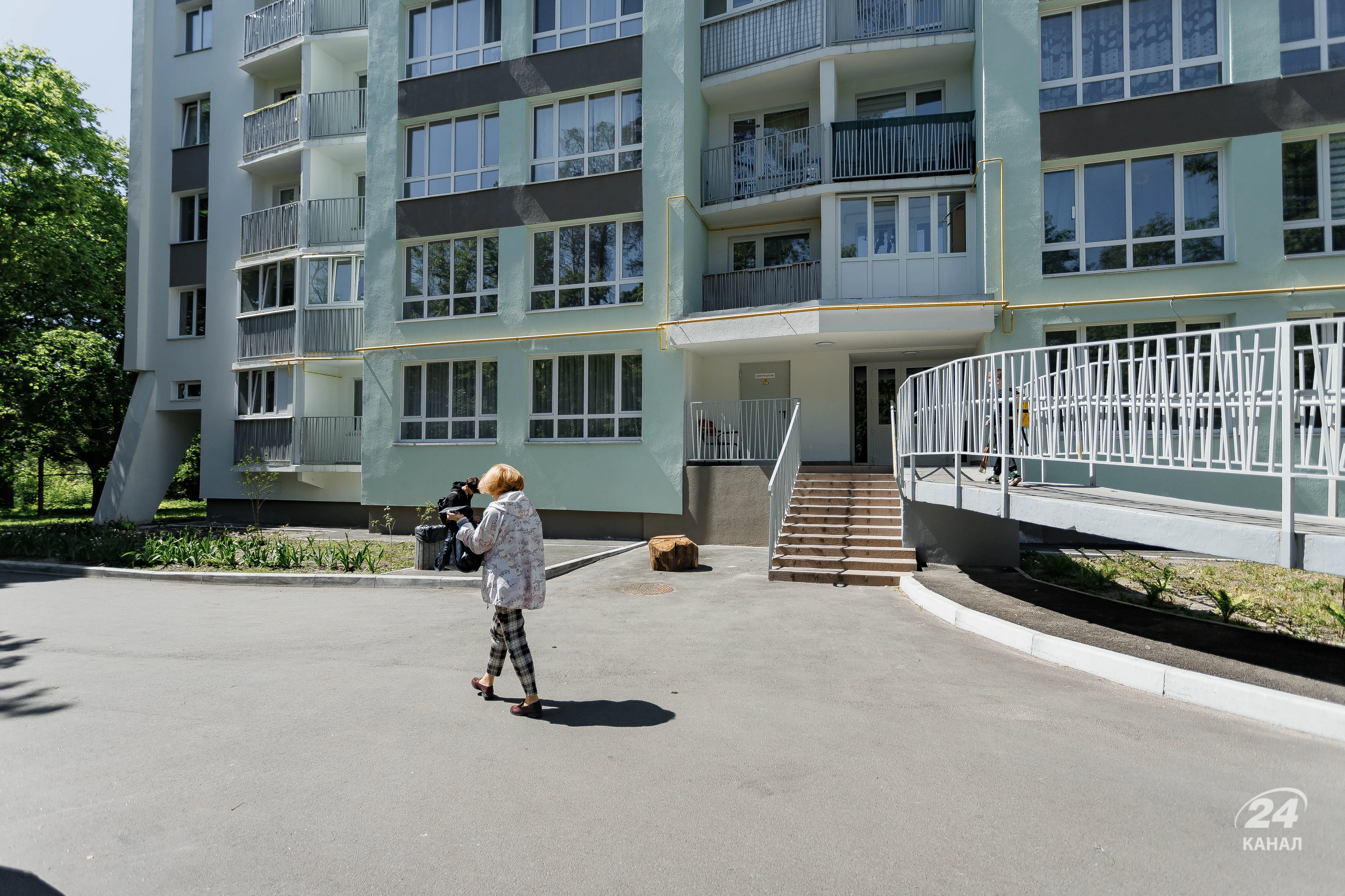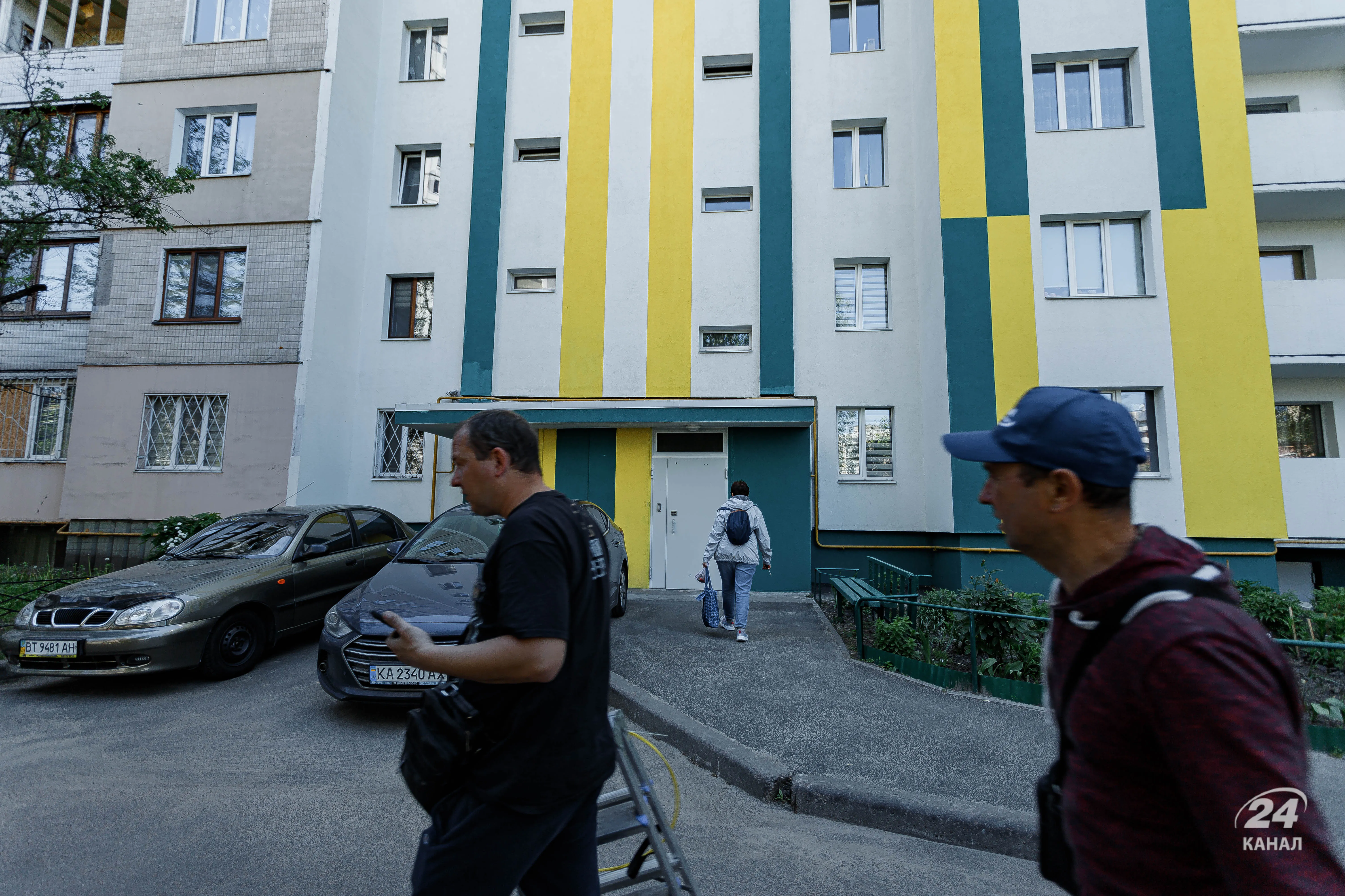 По сравнению с соседними, такими же домами, пострадавшая многоэтажка выглядит современно. Вход с пандусом, одинаковые чистые балконы и большие окна – образец для будущей термомодернизации советского жилья. Местность теперь напоминает больше окраины Берлина, чем киевский "спальник".
