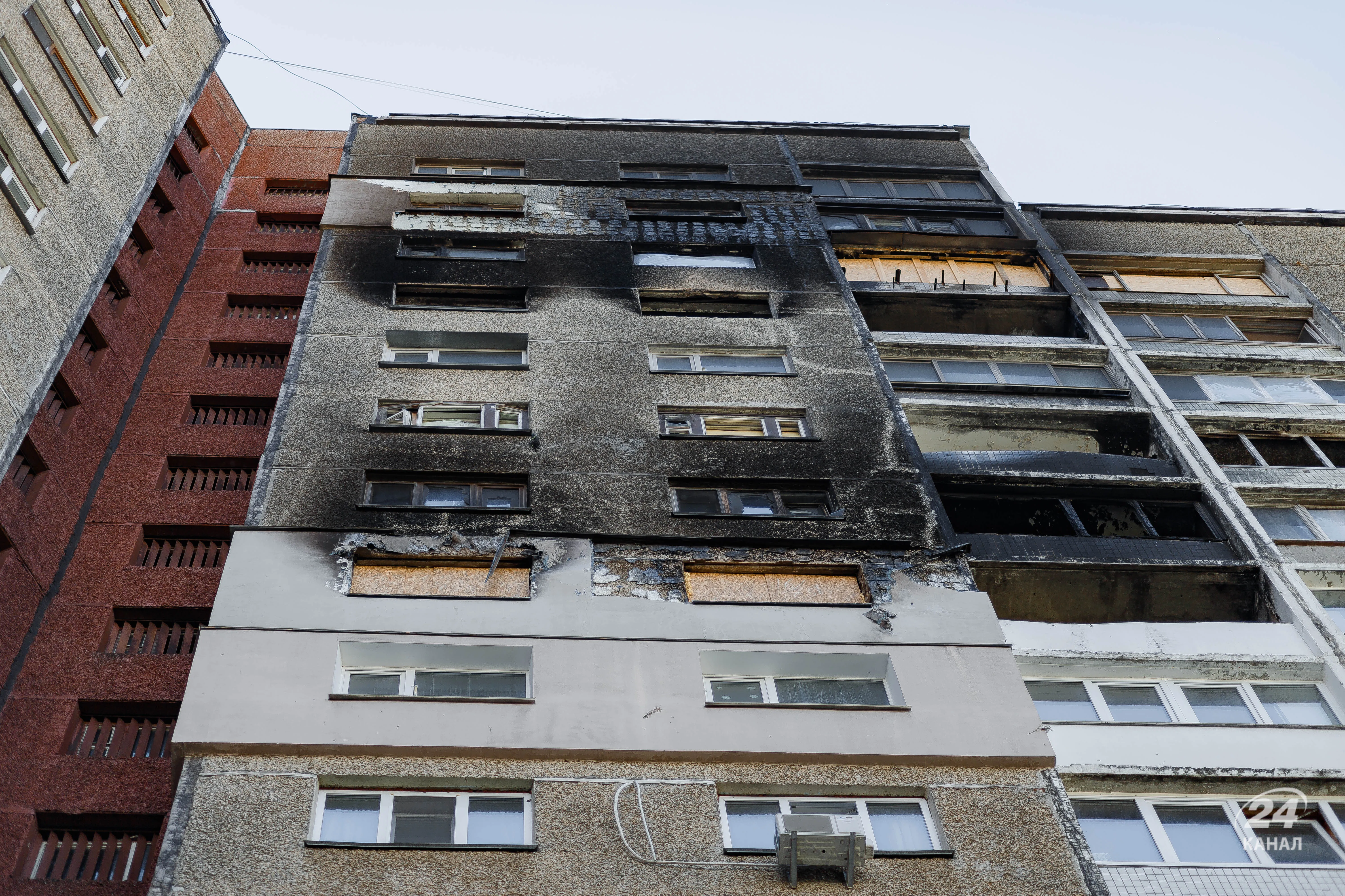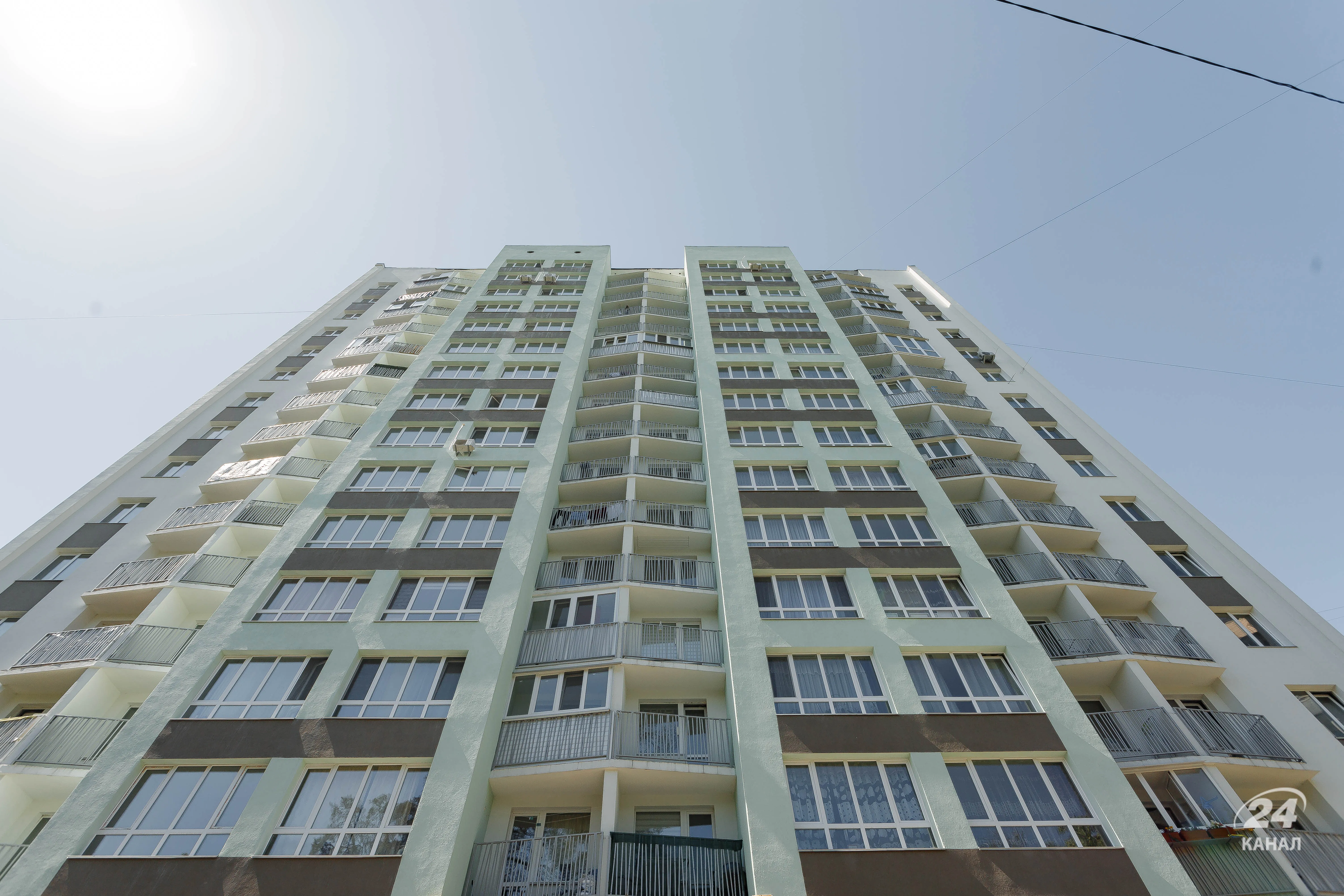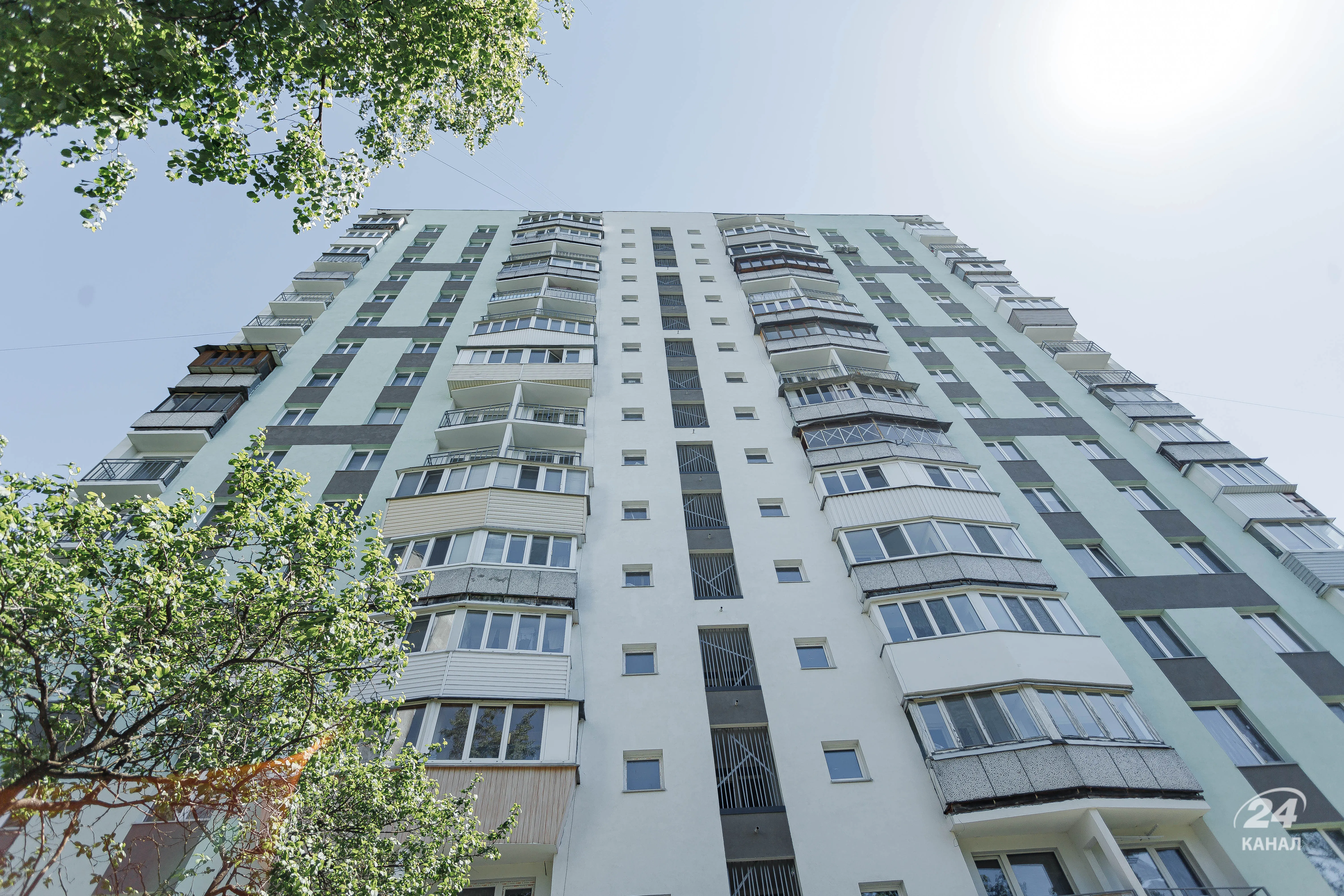 По сравнению с соседними, такими же домами, пострадавшая многоэтажка выглядит современно. Вход с пандусом, одинаковые чистые балконы и большие окна – образец для будущей термомодернизации советского жилья. Местность теперь напоминает больше окраины Берлина, чем киевский "спальник".