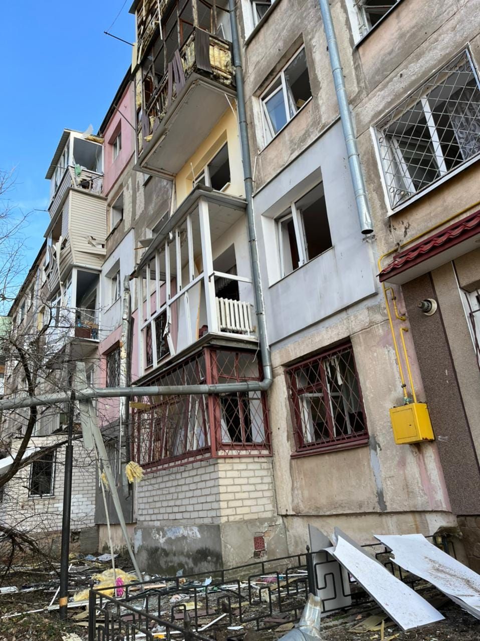 Заместитель главы Офиса Президента Кирилл Тимошенко рассказал, что земля с места падения снаряда летела до последнего этажа. В доме разрушены балконы и вылетели окна.