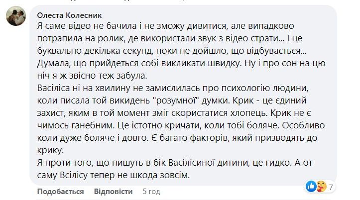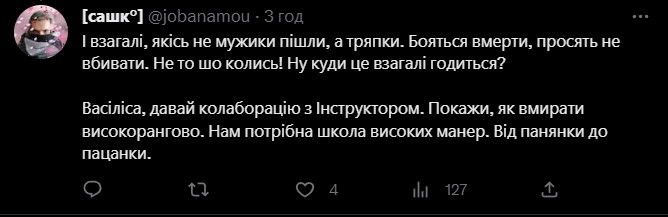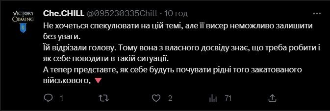 Осуждают подобные слова и гражданские украинцы. Прежде всего, они обращают внимание на то, что при такой ужасной казни человек не будет думать о том, насколько героически в этот момент будет выглядеть. Более того, предлагают сначала самой Василисе показать "как правильно и красиво умирать, когда тебе отрезают голову на камеру".
