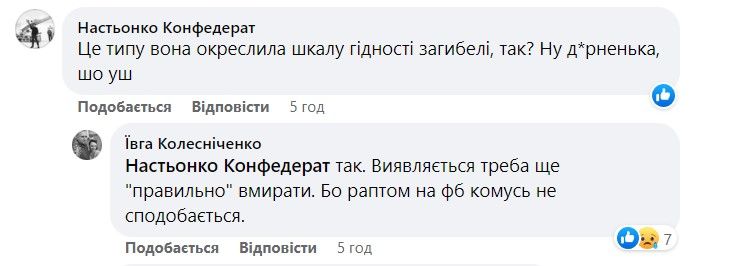 Отреагировала на циничное заявление и жена военного, отдавшего жизнь за Украину, Евга Колесниченко. Она обратила внимание и на чувства близких военных, "которые и без этих слов настолько погружены в свое горе, что хоть в петлю лезь". Женщина призвала перед опубликованием в сети "своего мнения" думать и о тех, кто прочтет эти слова.