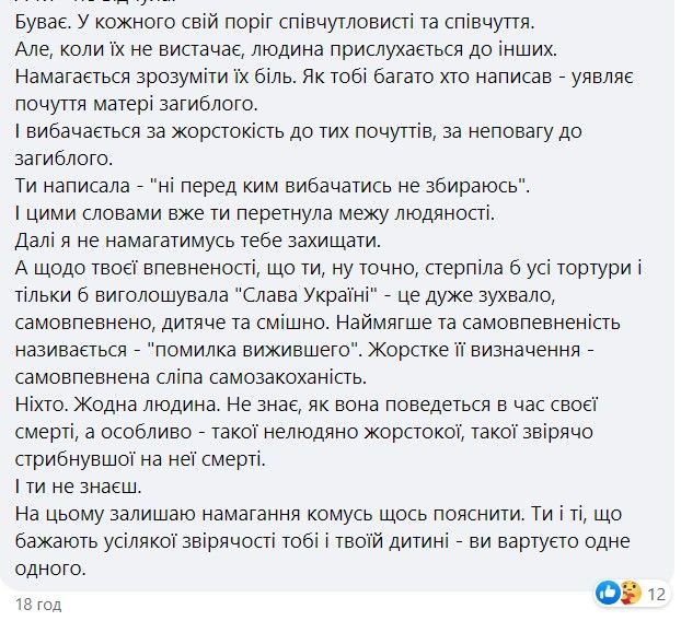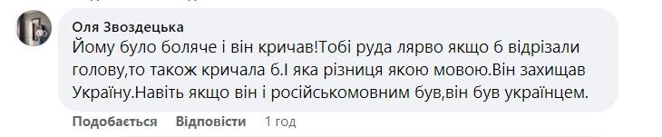 Волонтер и экс-прессофицер полка "Днепр-1" и добровольческого батальона "Донбасс" упрекнула воина за то, что в последние мгновения своей жизни он умолял россиян остановиться на языке оккупантов, а также сравнила с казненным Александром Мациевским. По ее словам, расстрелянный герой умер достойной смертью, а украинский солдат, которому отрезали голову – нет, таким образом сравнив два убийства на предмет "кто больший герой" во время казни. Ожидаемо, что такое заявление вызвало волну осуждения и реакций не только гражданских, но и военных, пишет 24 Канал.