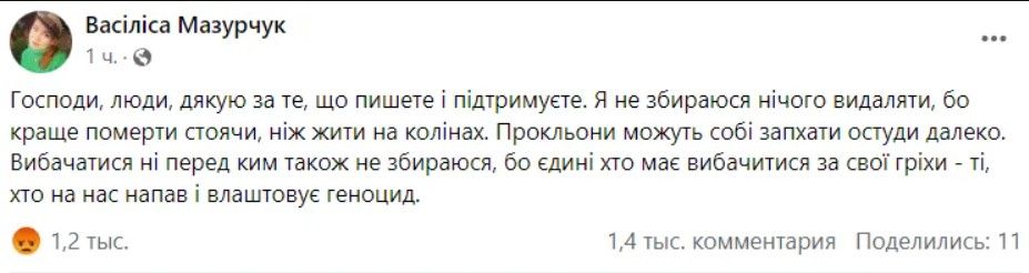 Заметим, что Василиса Мазурчук, несмотря на заявления, удалила оба своих сообщения с фейсбук-страницы. Однако прощения за свои всколыхнувшие общество заявления так и не попросила.