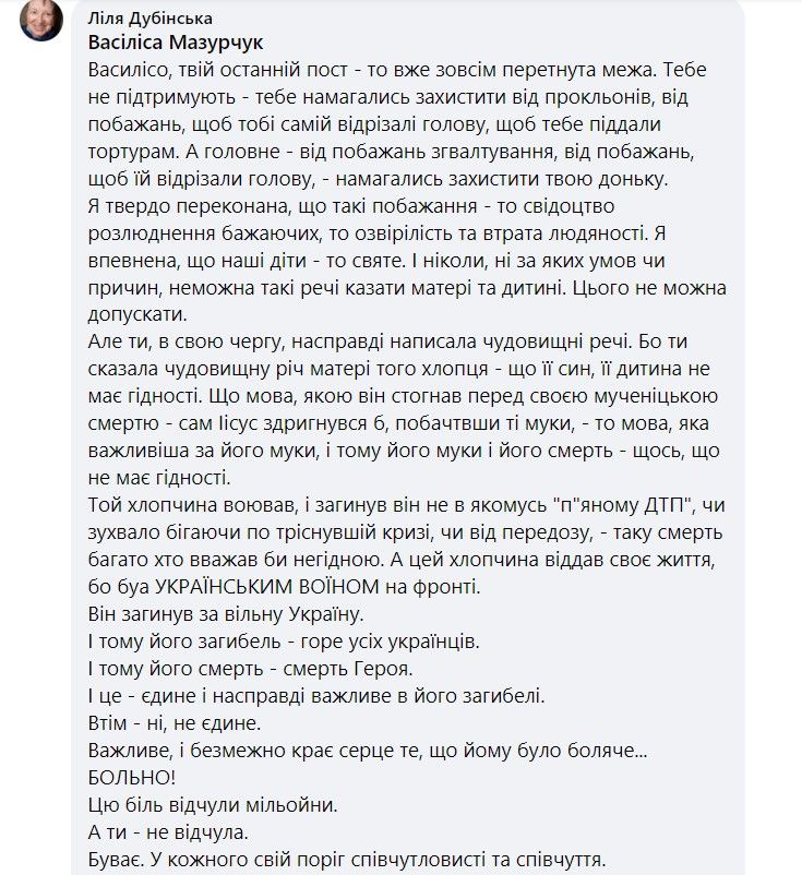 Однако нашлись и те, кто пытался броситься в защиту экс-прессофицерши. Лиля Дубинская на своей фейсбук-странице призвала остановиться в волне хейта, в которой, по ее мнению, украинцы звереют на глазах и теряют человечность. А направить свою ненависть на оккупантов.
