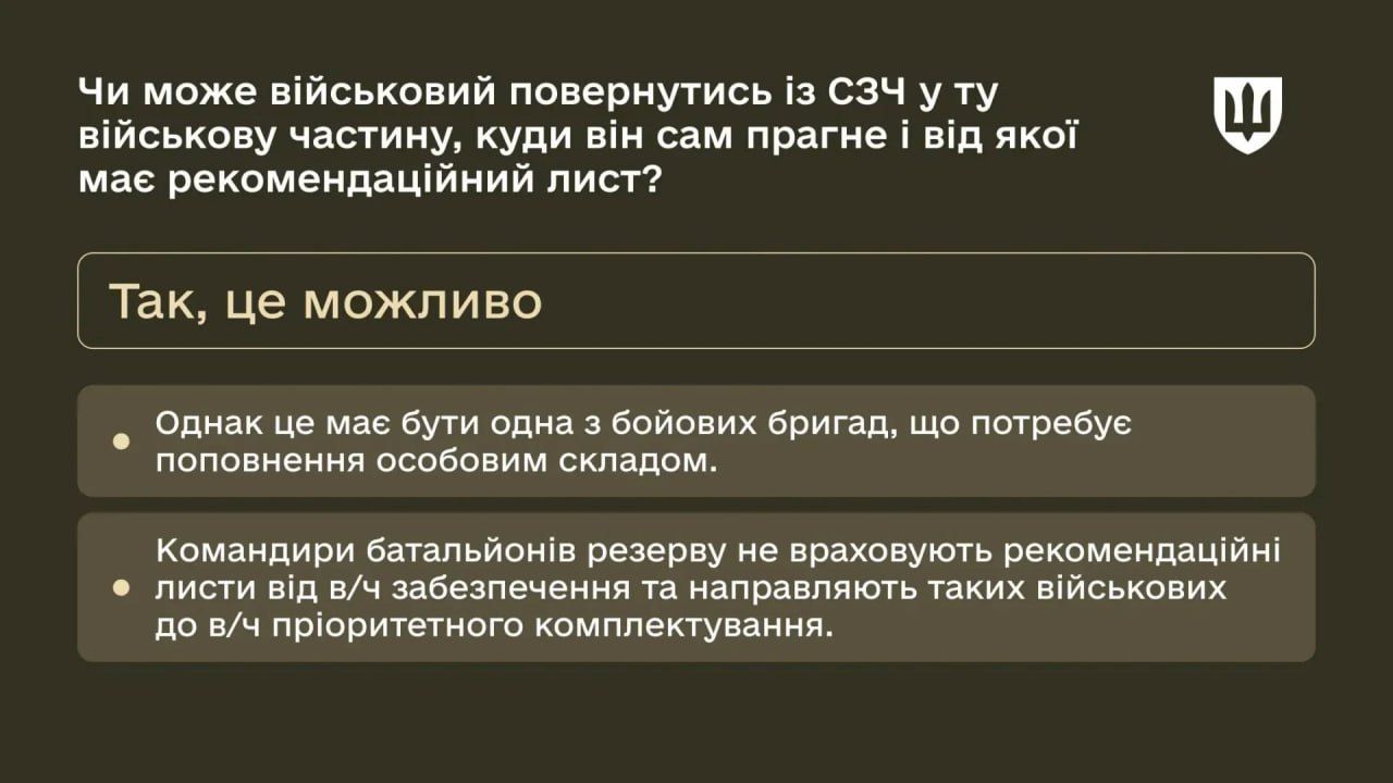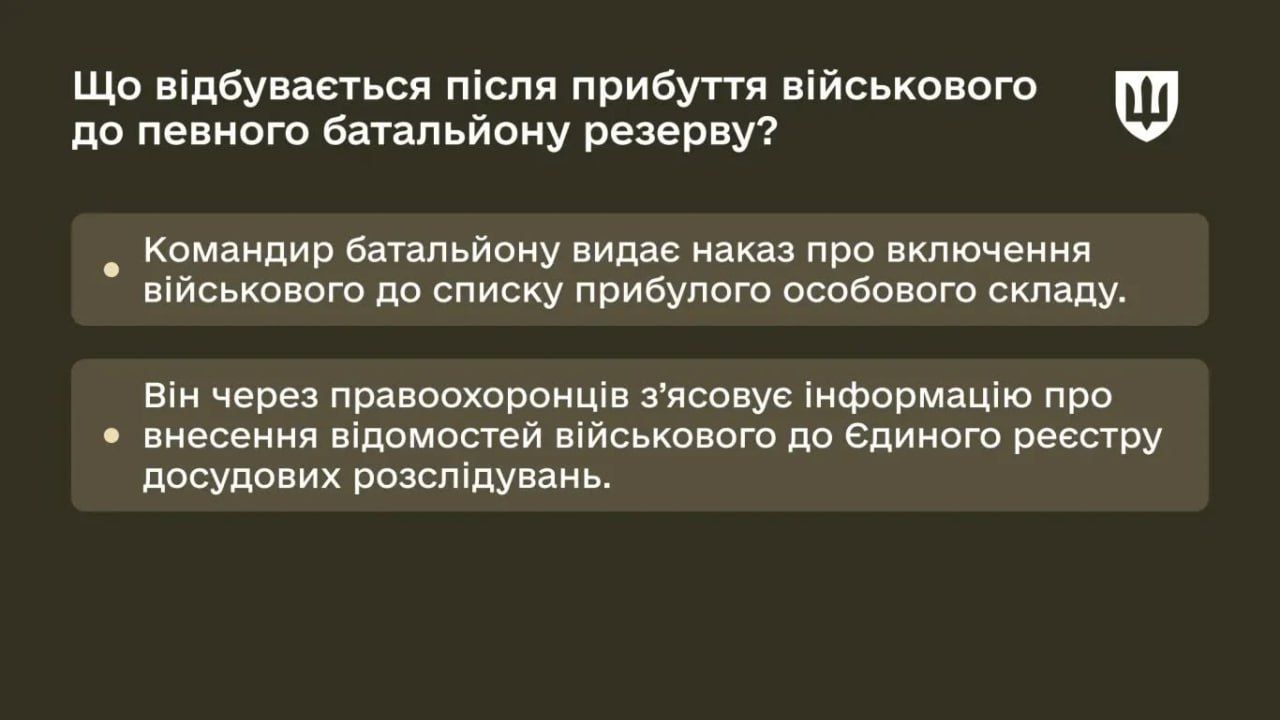 По информации министерства, военный может обратиться в органы Военной службы правопорядка (ВСП) Вооруженных Сил Украины, в частности в Центральное управление или территориальные и зональные подразделения. Там предоставляют информацию о батальонах резерва и оформляют предписание для дальнейшего прохождения службы.
