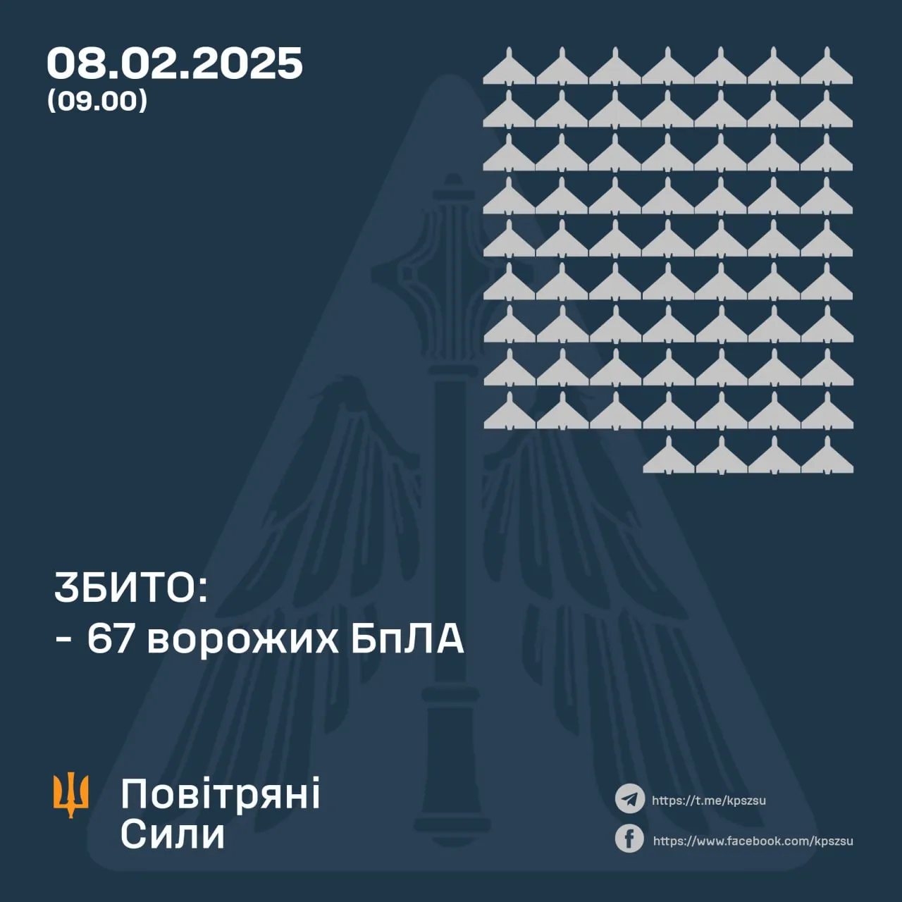 По состоянию на 09:00 подтверждено сбитие 67-ми ударных БПЛА типа Shahed и беспилотников других типов в Киевской, Харьковской, Полтавской, Сумской, Черкасской, Черниговской, Кировоградской, Винницкой, Житомирской, Хмельницкой, Запорожской, Днепропетровской, Донецкой и Одесской областях,