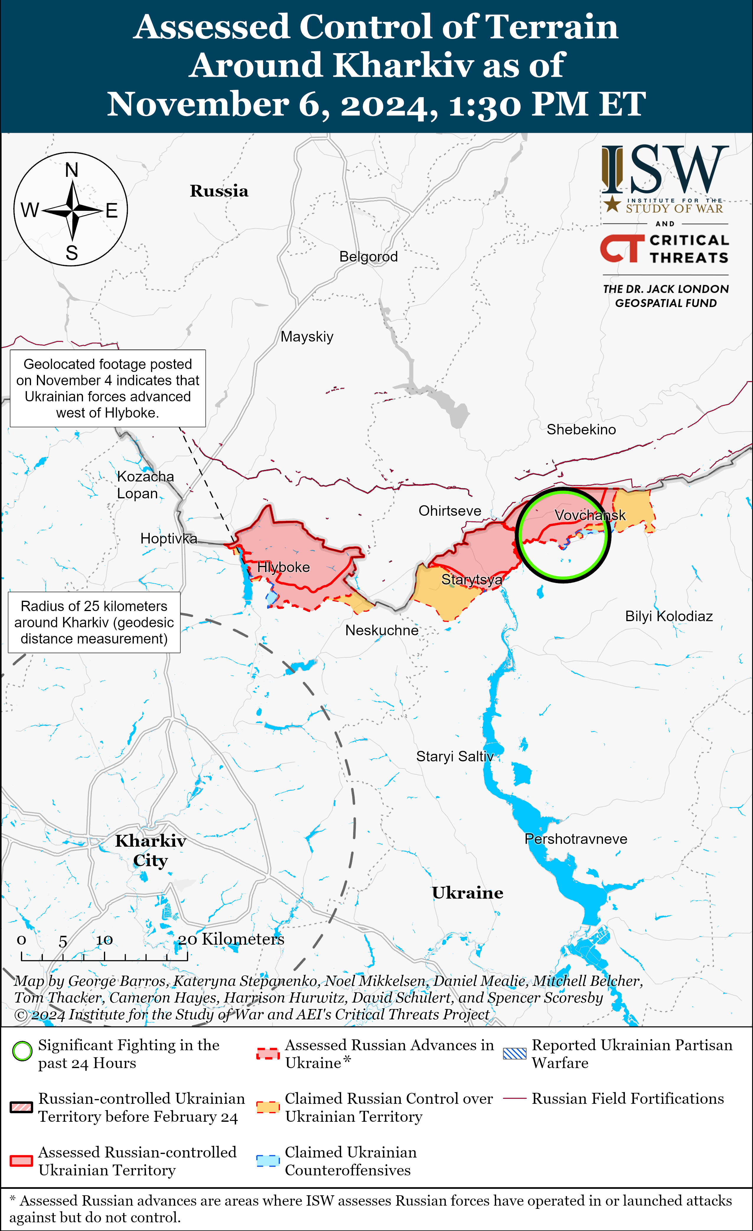 - Российские войска 5 и 6 ноября продолжали ограниченные наступательные действия к северо-востоку от Харькова вблизи Волчанска и Старицы, но не продвинулись.