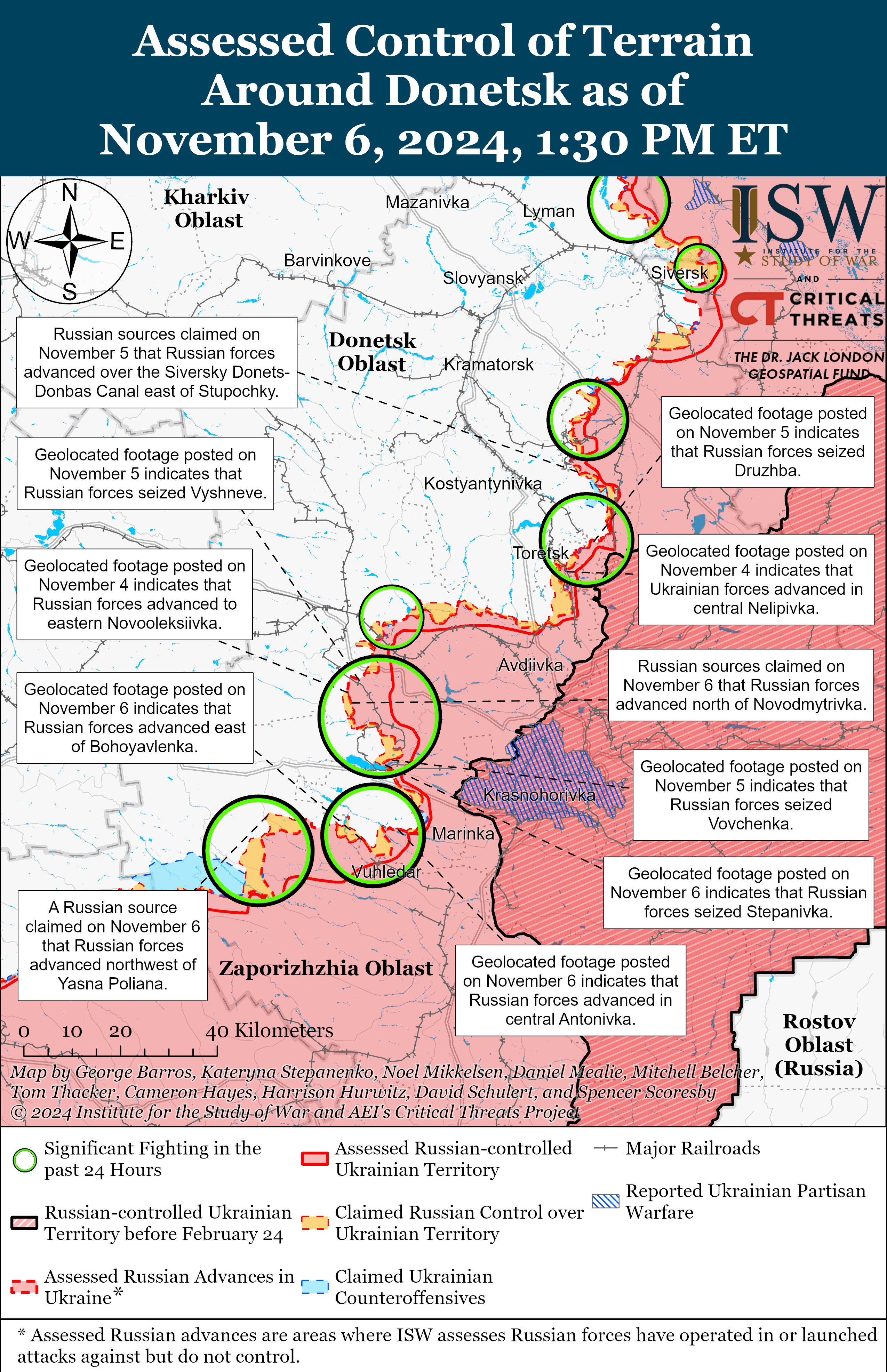 Подытоживая сводки, Институт изучения войны отмечает, что российские войска за 6 ноября продвинулись на Купянском, Сватово, Покровском, Кураховском и Угледарском направлениях.