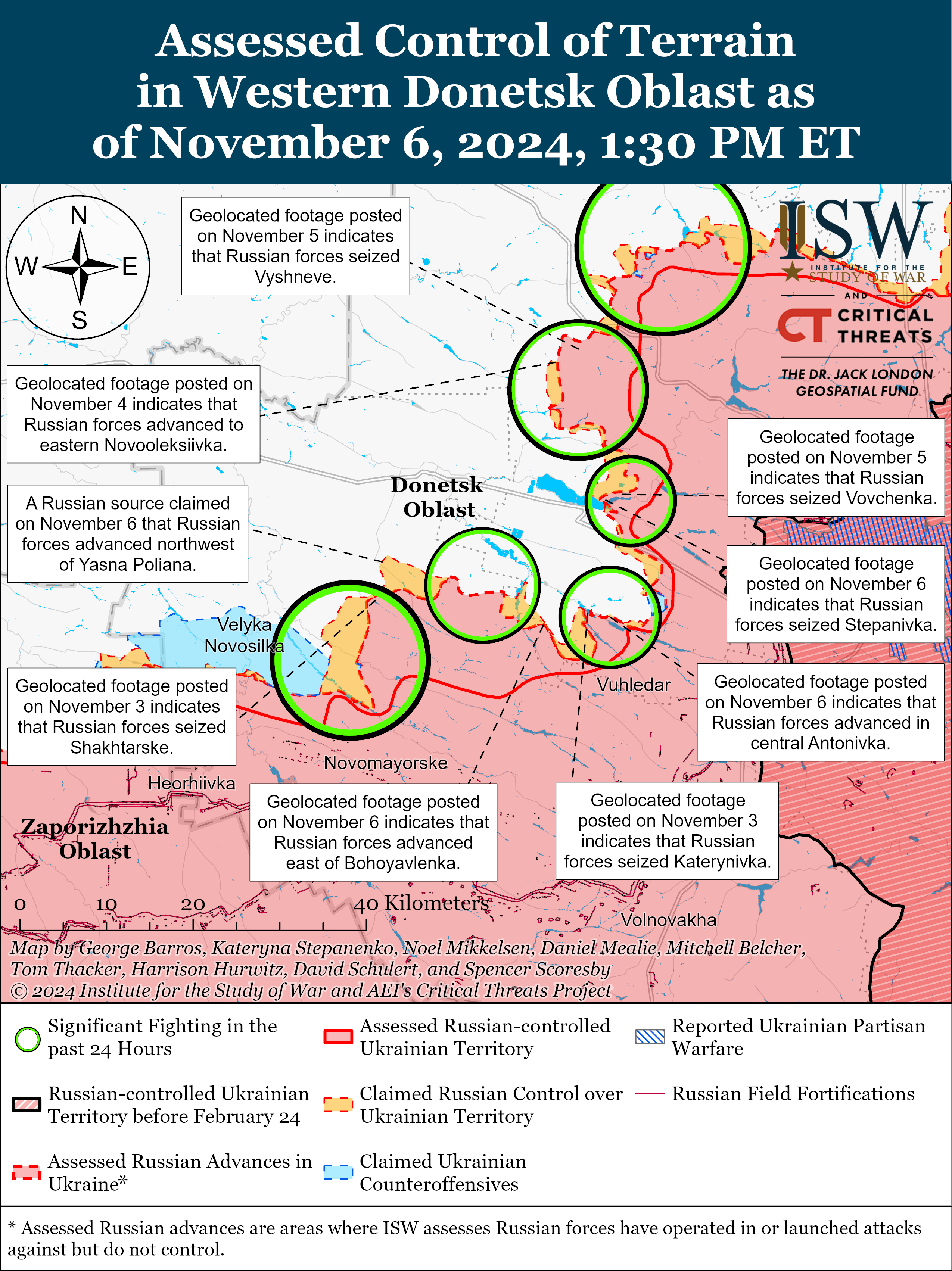 - 6 ноября продолжались ограниченные бои на территории Курской области России, но ни украинские, ни российские силы не подтвердили продвижения.
