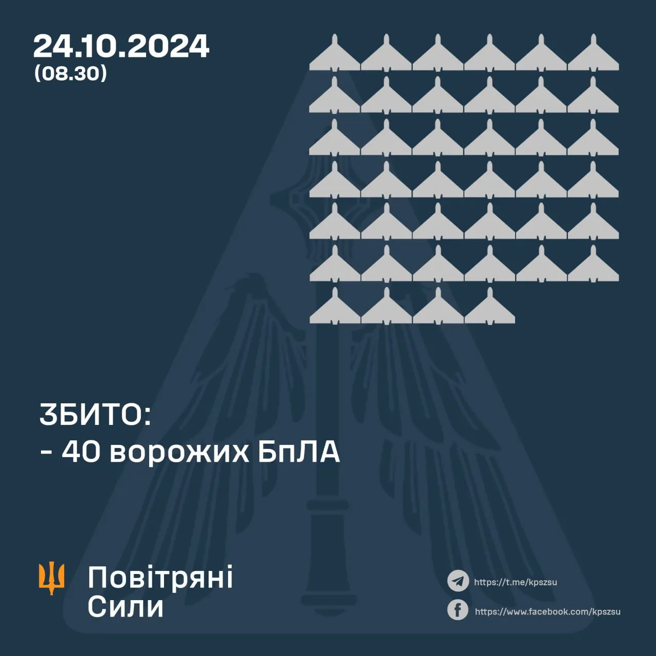 По состоянию на пол 9 утра 24 октября сбито 40 вражеских БпЛА / Инфографика Воздушных Сил