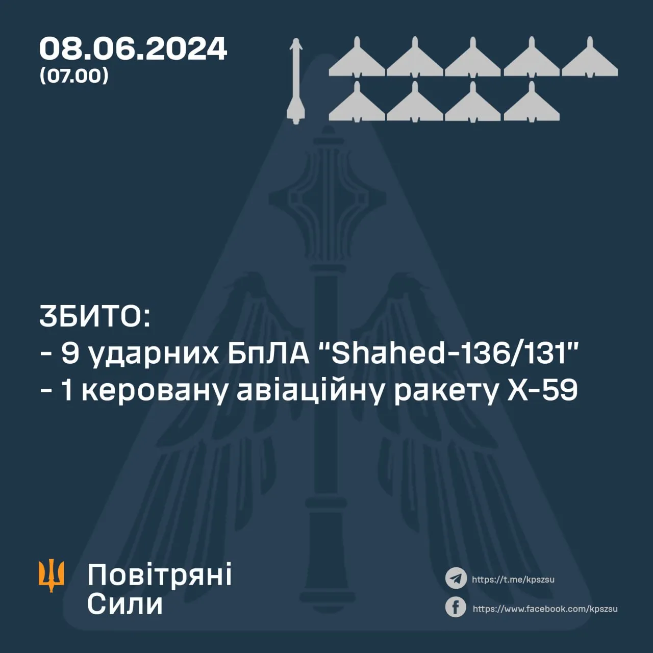 В ночь на 8 июня российские войска атаковали управляемой авиационной ракетой Х-59 из российской Курской области и выпустили 13 ударных БПЛА типа "Шахед". Оккупанты запускали дроны из районов Курска и мыса Чауда, что в Крыму.