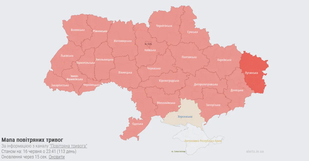 Из-за угрозы вражеских обстрелов 16 июня примерно в 23:30 во всех областях Украины объявили воздушную тревогу. Сирены звучали в: