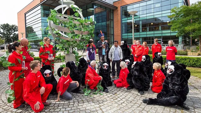 Кампания по защите Арктики от промышленного рыболовства и нефтедобычи сопровождалась "прогулкой" огромного белого медведя улицам. "Гринписовцы" известные и борьбой с крупными компаниями и корпорациями.