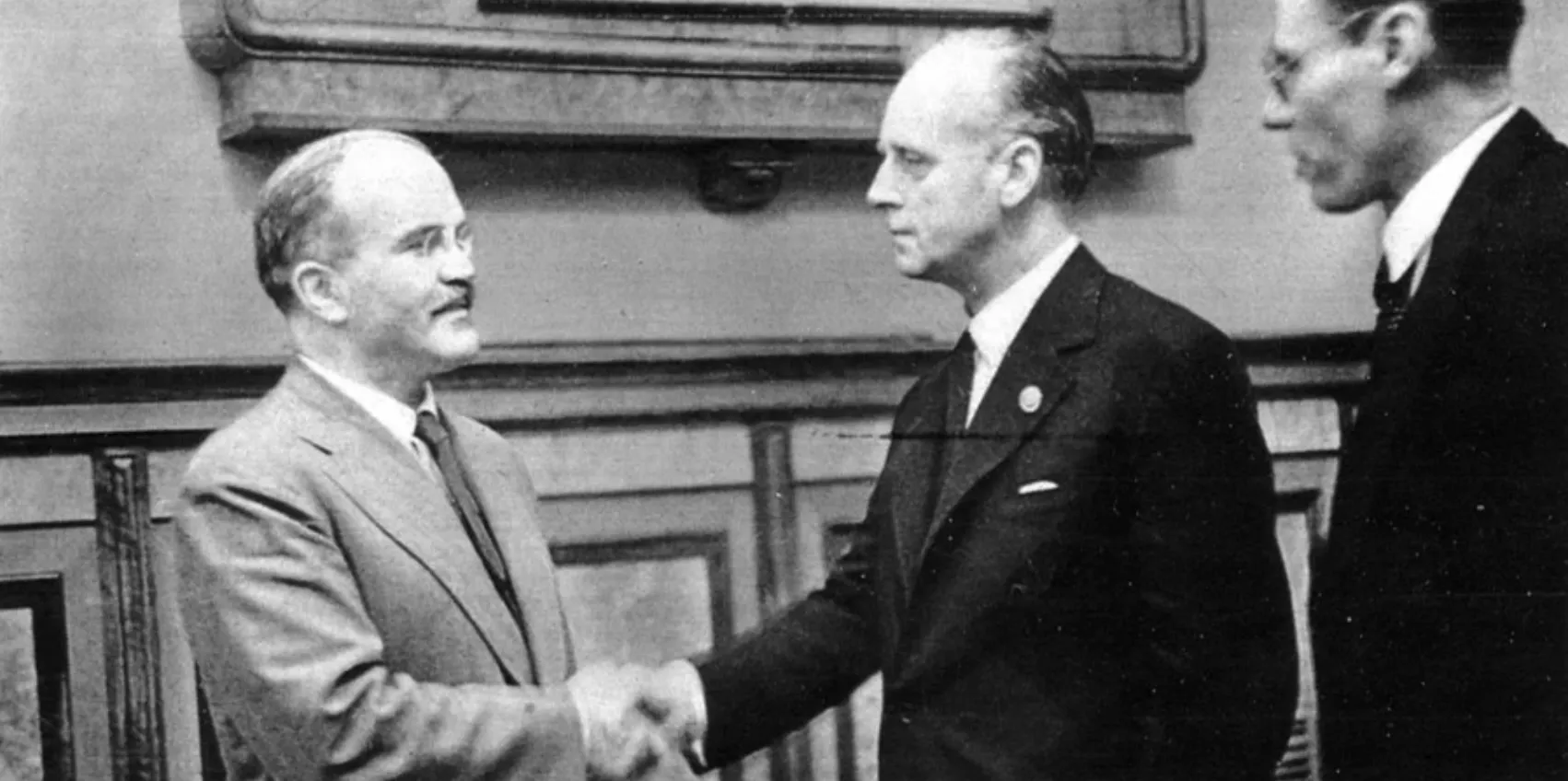 Вячеслав Молотов и Иоахим фон Риббентроп обмениваются рукопожатием / Фото из архивов