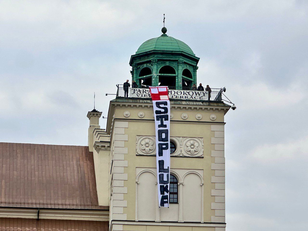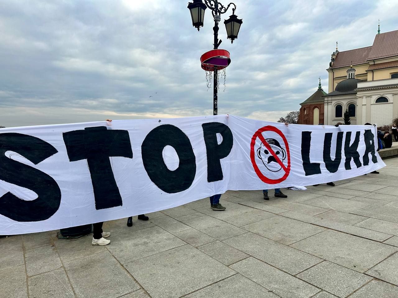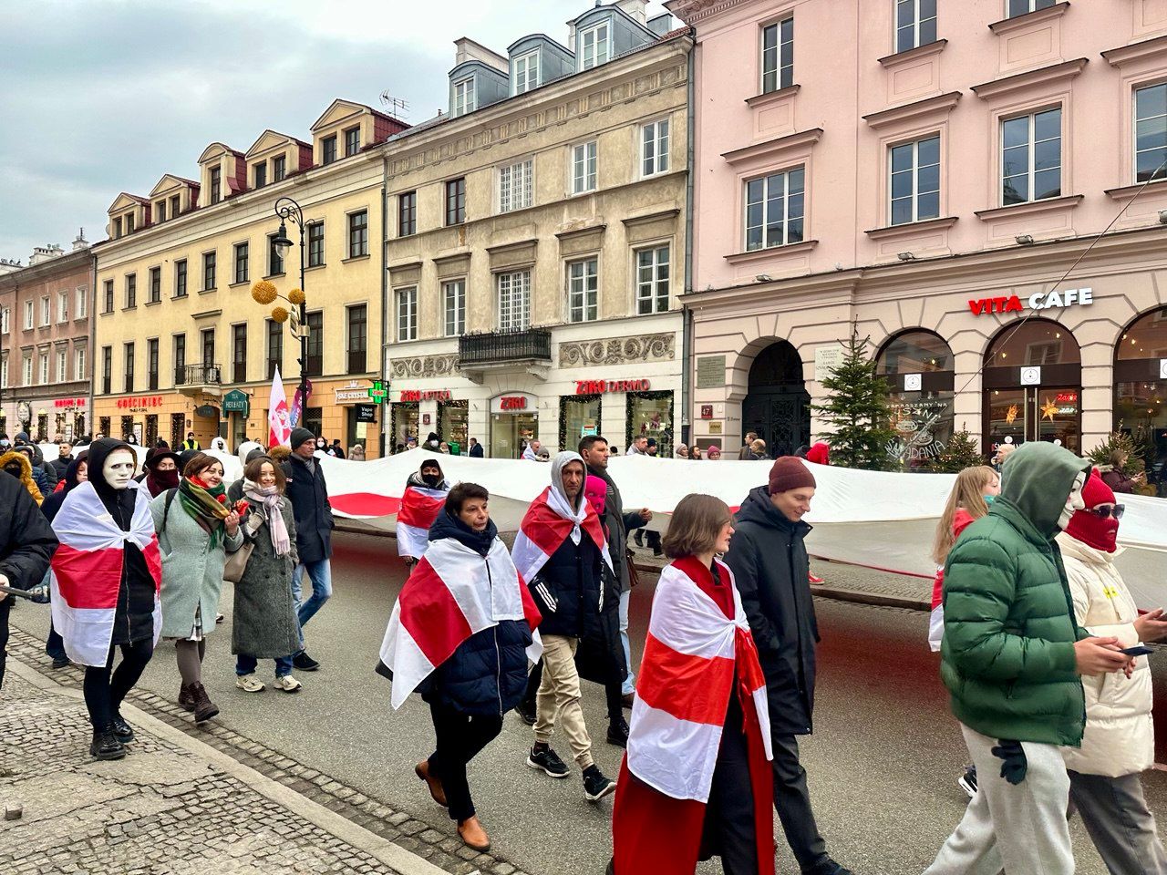 Люди пришли на митинг в Варшаве с бело-красно-белыми флагами и саркастическими плакатами о белорусском диктаторе. Главным символом марша стал большой флаг, который несли до финальной точки несколько десятков человек. Шествие прошло под названием "Не мой выбор" в день переназначения на седьмой срок "президента" Лукашенко.
