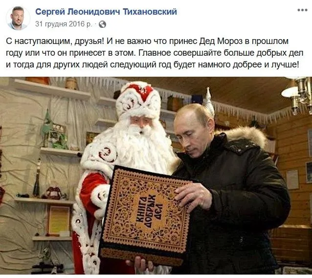 О мировоззрении Тиховновского говорят и его посты в социальных сетях. К примеру, накануне Нового года он поздравил своих подписчиков иллюстрацией с Владимиром Путиным. Это было 31 декабря 2016 года. Война в Украине, которую развязал президент РФ, на тот момент длилась уже больше двух лет.