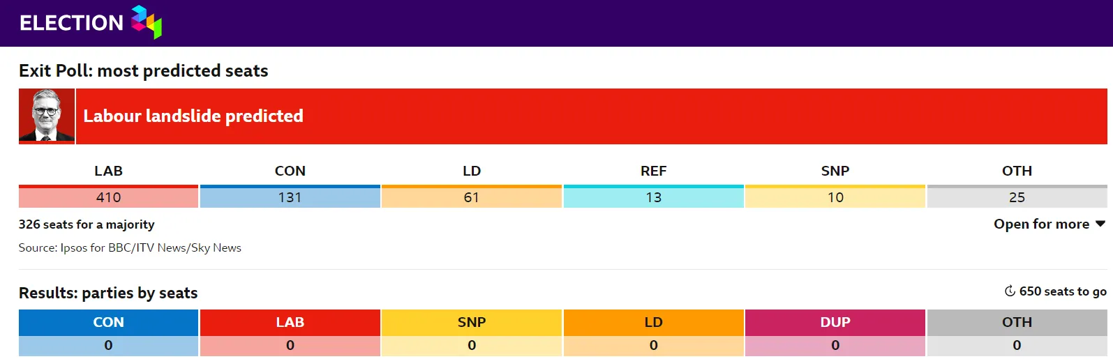 Согласно данным экзитпола, лейбористы во главе с Киром Стармером получили 410 мест в новом парламенте. А вот консерваторы в этой гонке терпят значительное поражение.