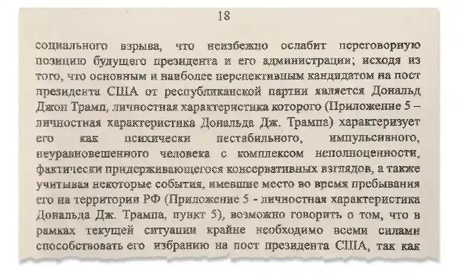 Доклад характеризовал Трампа как человека с "психической нестабильностью, импульсивностью и комплексом неполноценности". В документе отмечалось, что избрание Трампа будет способствовать дестабилизации внутренней политической ситуации в США, что соответствовало стратегическим интересам России.