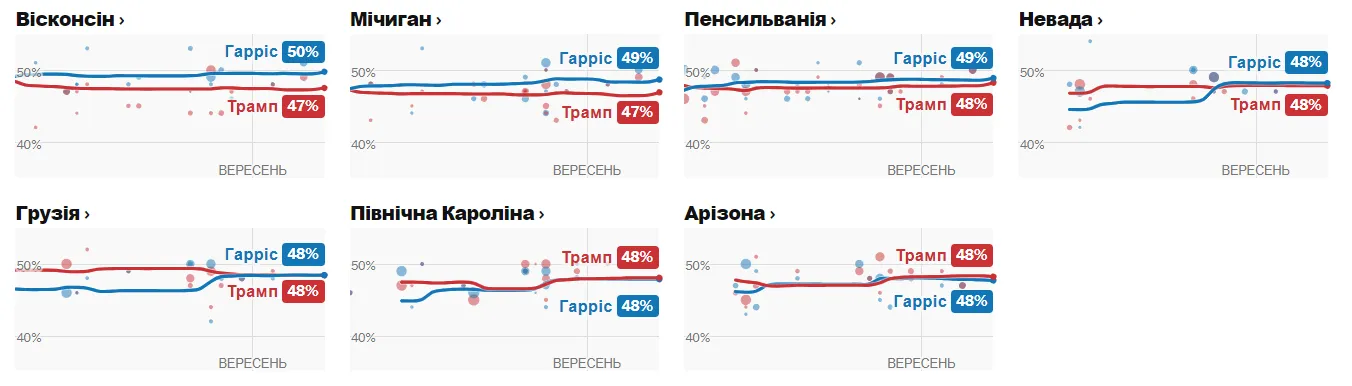 В штатах, которые являются ключевыми в избирательной гонке, Харрис находится на уровне с Трампом, а иногда имеет незначительное преимущество.