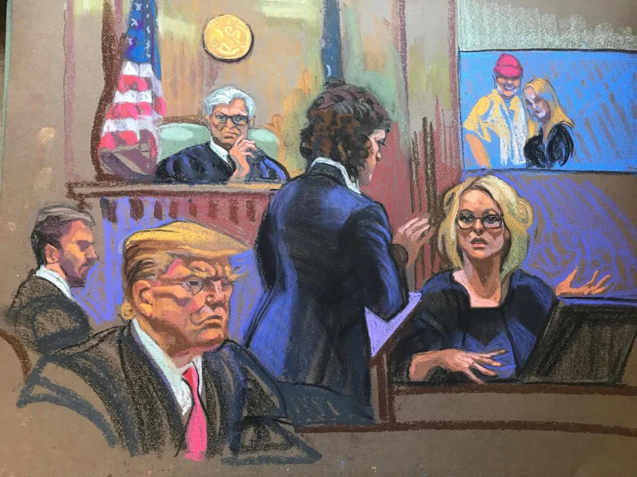 Судебное заседание по делу Трампа, момент, когда госпожа Дэниелс дает свои пространные показания / Иллюстрация CNN