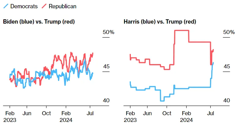 Опросы Morning Consult начали фиксировать большую привлекательность вице-президента как кандидата на выборах от демократов после того, как Джо Байден неудачно выступил на дебатах с Трампом в конце июня.