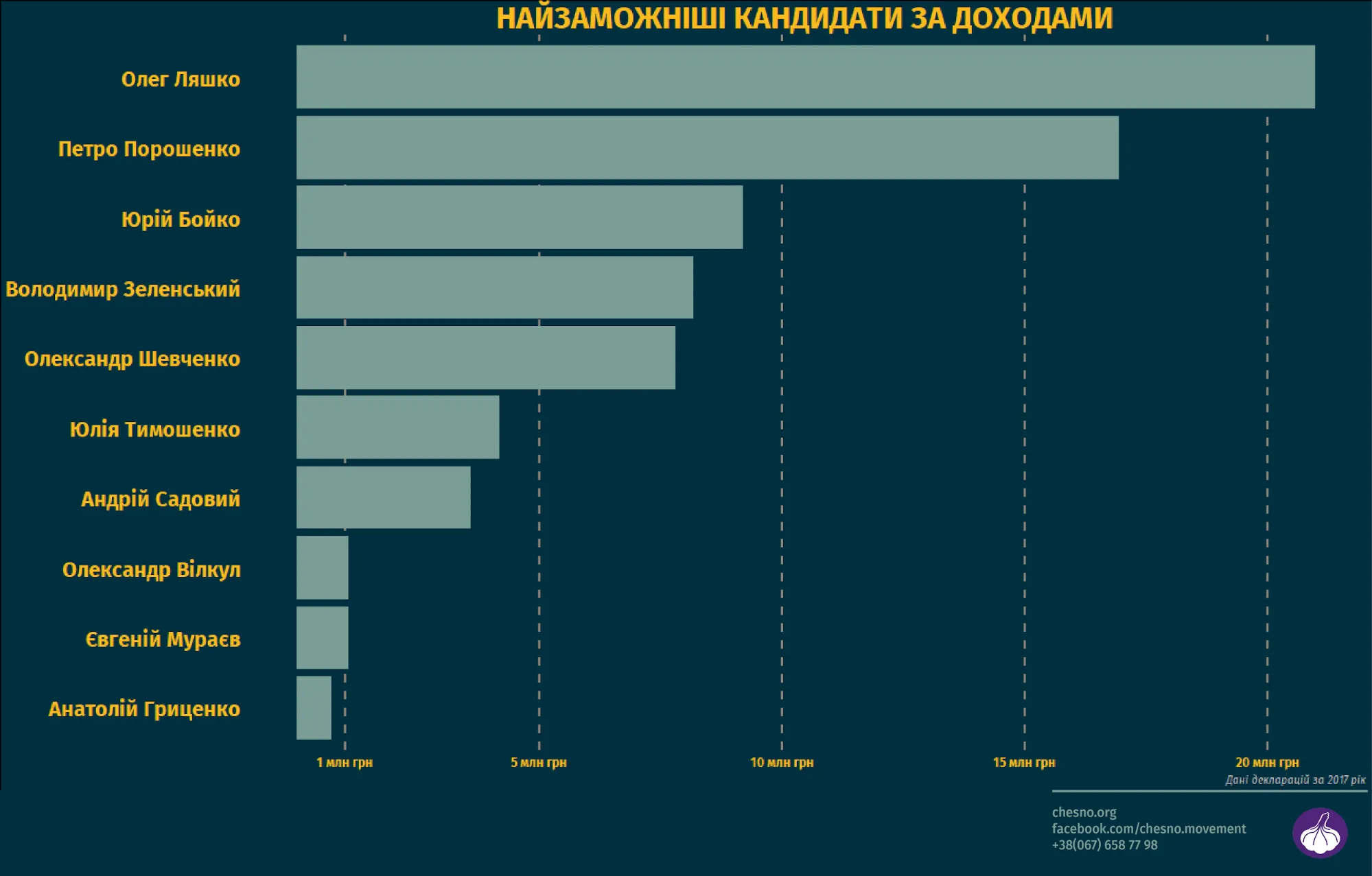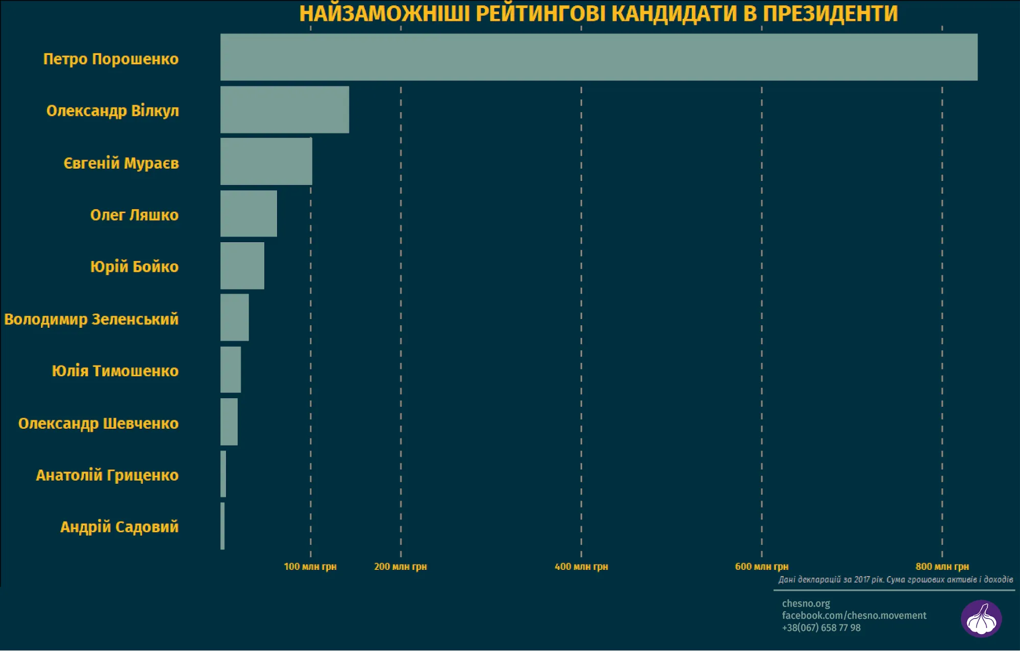 В перечень попали 10 кандидатов с самыми высокими рейтингами: президент Петр Порошенко, шоумен Владимир Зеленский, народные депутаты Юлия Тимошенко, Олег Ляшко, Юрий Бойко, Александр Вилкул, Евгений Мураев, Александр Шевченко, мэр Львова Андрей Садовый и экс-министр обороны Анатолий Гриценко. Их состояние из представленных деклараций за 2017 год проанализировало общественное движение "Честно".