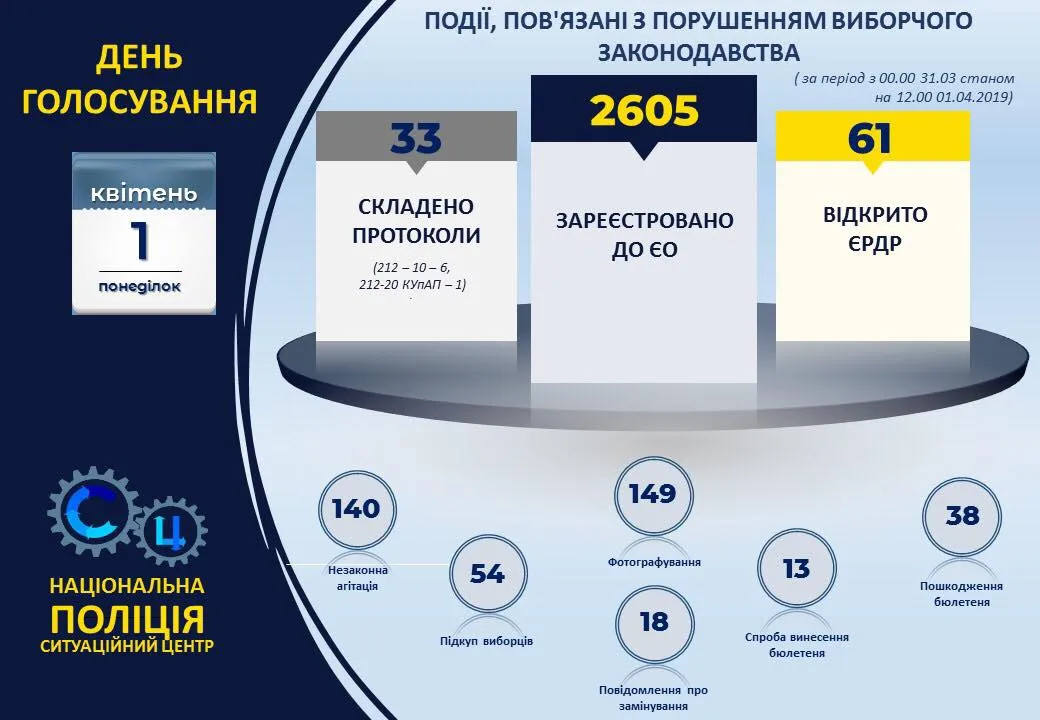 По фактам нарушений полиция уже открыла 61 уголовное производство. Больше всего по следующим статьям: "Фальсификация избирательных документов" – 31, "Нарушение тайны голосования" – 12, "Воспрепятствование осуществлению избирательного права" – 6, "Террористический акт" – 4, "Заведомо ложное сообщение о заминировании" – 4. Кроме того, известно о возбуждении уголовных производств по статьям "Умышленное легкое телесное повреждение", "Хулиганство", "Подкуп избирателя".