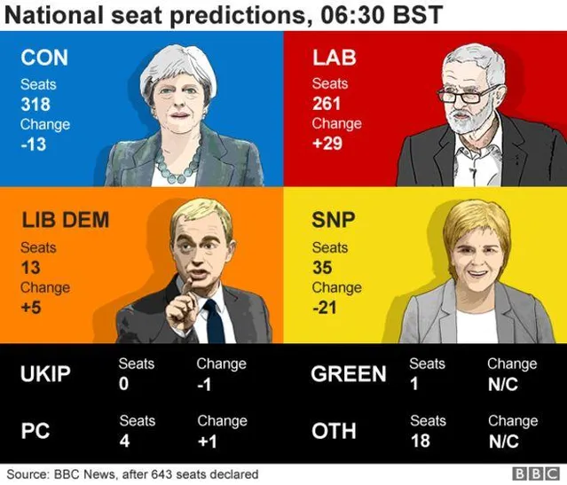 Лидер Консервативной партии, действующий премьер Тереза Мэй заявила, что не собирается покидать пост главы британского правительства и планирует вступить в союз с Демократической юнионистской партией Северной Ирландии, чтобы получить 328 мандатов в новом парламенте.