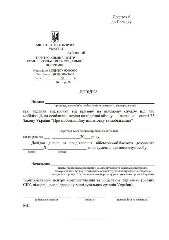 В военно-учетных документах мужчин, которые имеют отсрочку от призыва или исключены из воинского учета по состоянию здоровья, должна содержаться информация о получении такой отсрочки или исключения из воинского учета или справка по форме, определенной в приложении 6 Порядка проведения призыва граждан на военную службу по мобилизации, на особый период, утвержденного постановлением Кабинета Министров Украины от 16 мая 2024 №560.