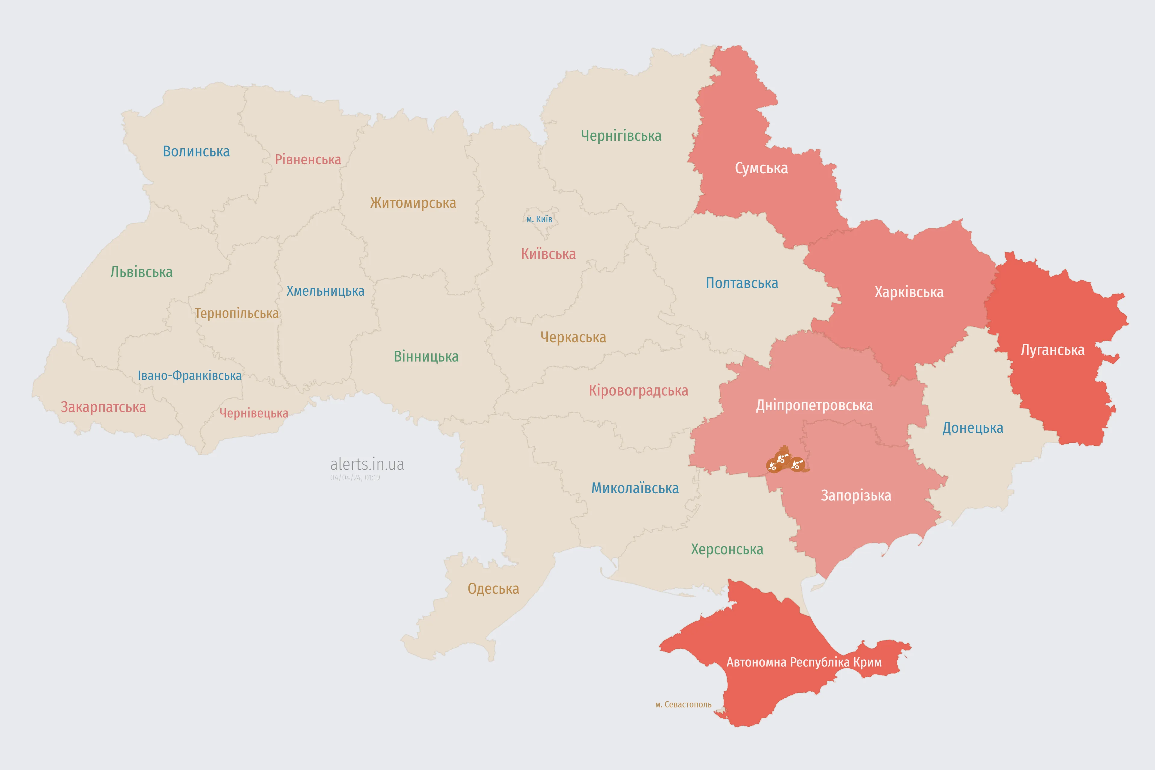 Карта тревог в Украине по состоянию на 01:20 4 апреля 2024 года