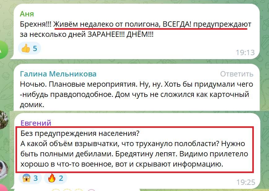 Так, какой-то Алексей в телеграмме написал, что проживает рядом с полигоном, и о любых испытаниях местные власти обычно предупреждают заранее. Впрочем, на этот раз такого не сделали. "Ложь", – отреагировал мужчина на оправдание мчс России.
