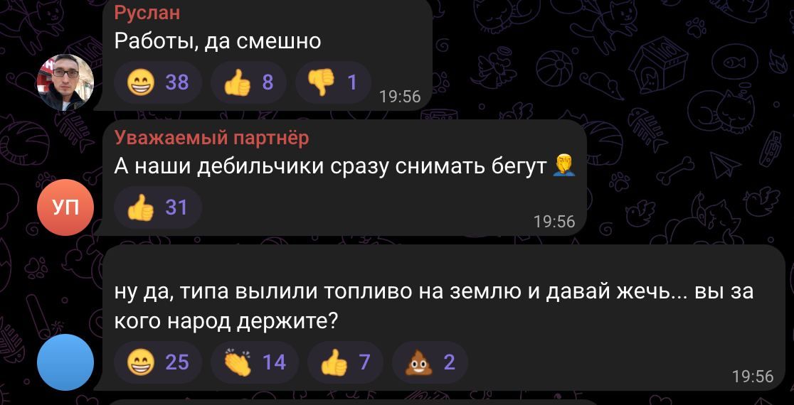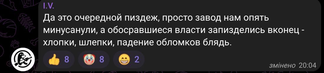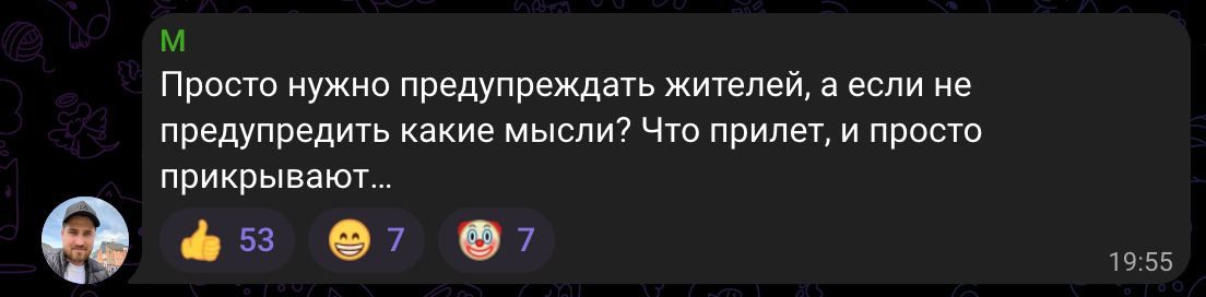 Также люди осознают, что российские власти придумывают байки, поскольку, вероятно, "хорошо прилетело во что-то военное". С грустью местные подытоживают, что, очевидно, "минуснули" им очередной завод, а власть не имеет смелости, чтобы это признать.