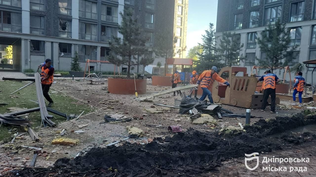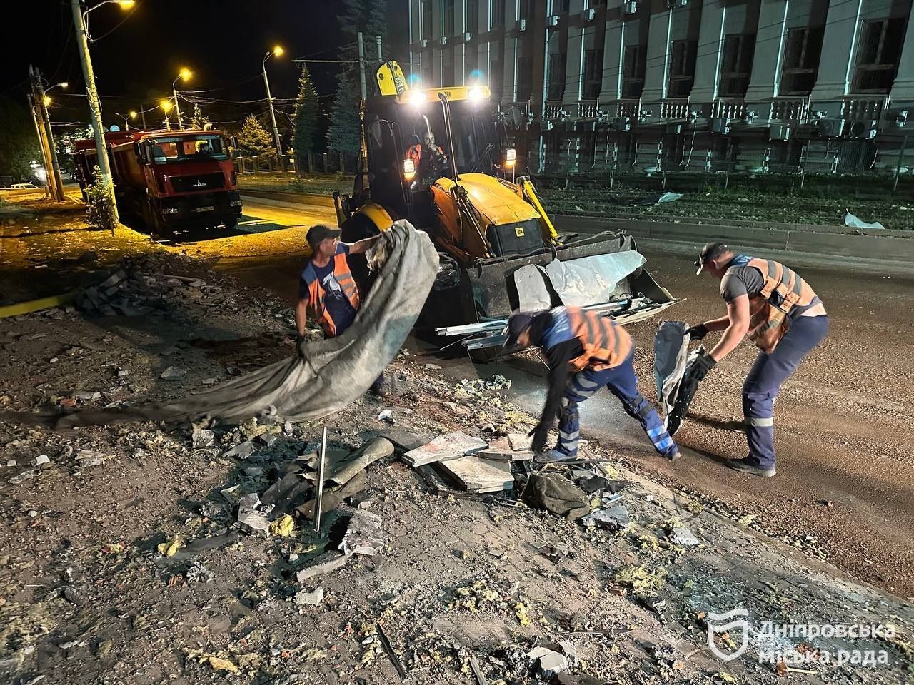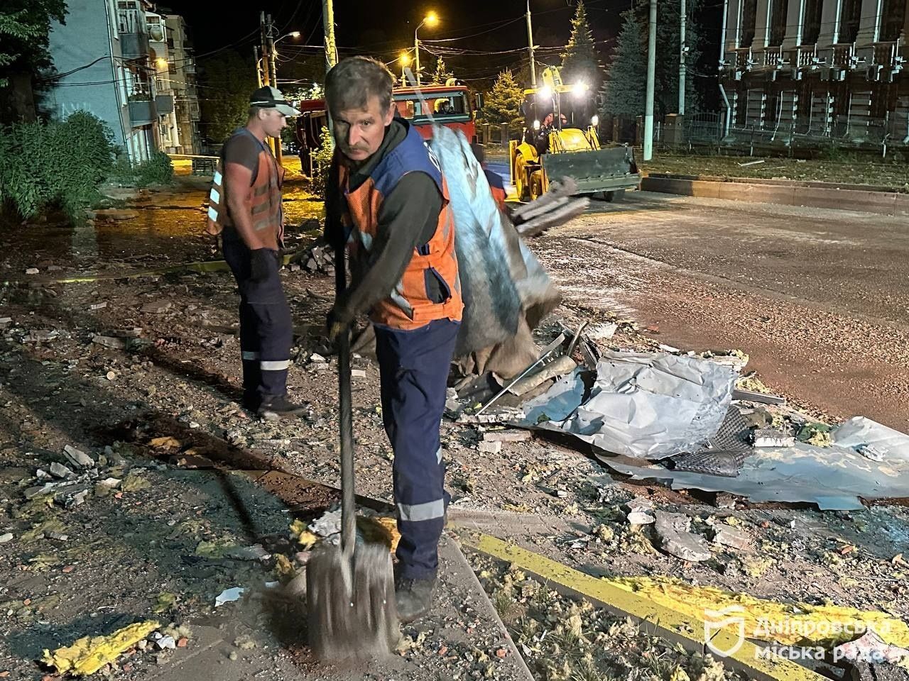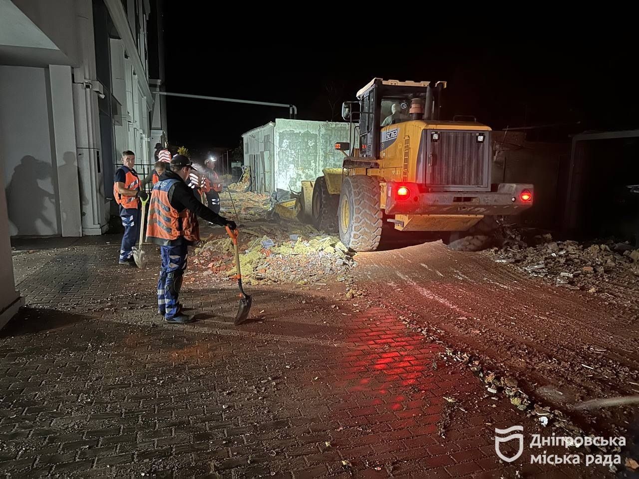 В Днепровском городском совете сообщили, что более 10 часов на месте удара работают 35 человек, которые разбирают завалы, вывозят мусор, а также очищают дорожное покрытие, тротуары и двор.