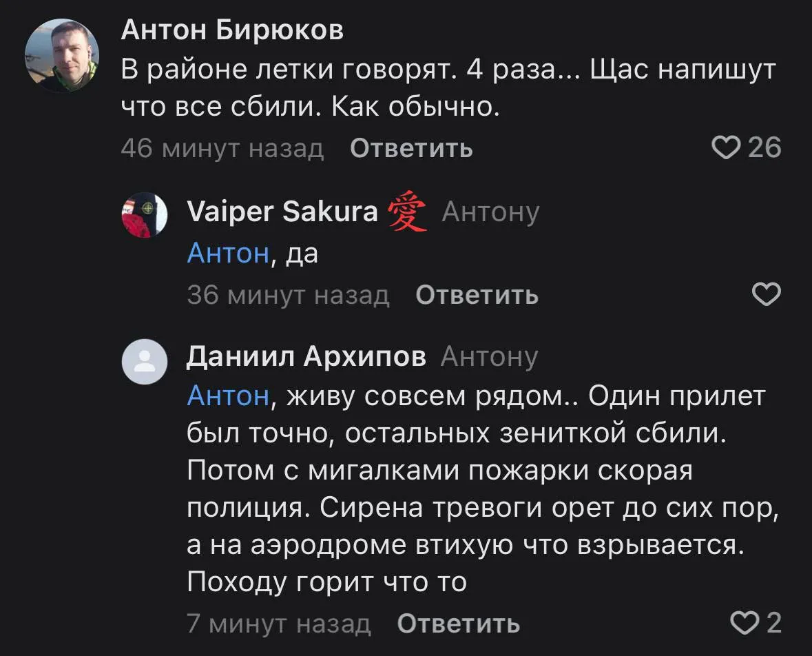 Впрочем, местные жители не слишком верят в рассказы местных властей и утверждают, что слышали по меньшей мере 4 взрыва на аэродроме в Энгельсе.