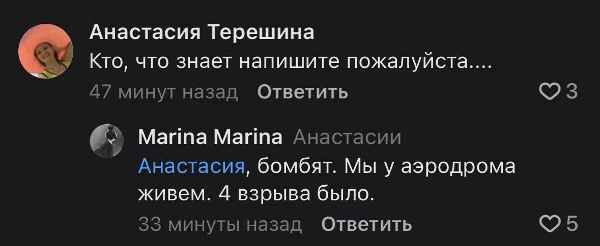 Также они заявляют, что "один прилет точно был". Сразу после взрыва на аэродром приехали полиция, пожарные и медики.