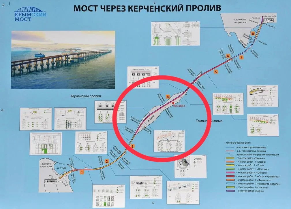 Отмечают, что взрывы произошли на 145-й опоре моста, расположенной по схеме на острове Тузла.