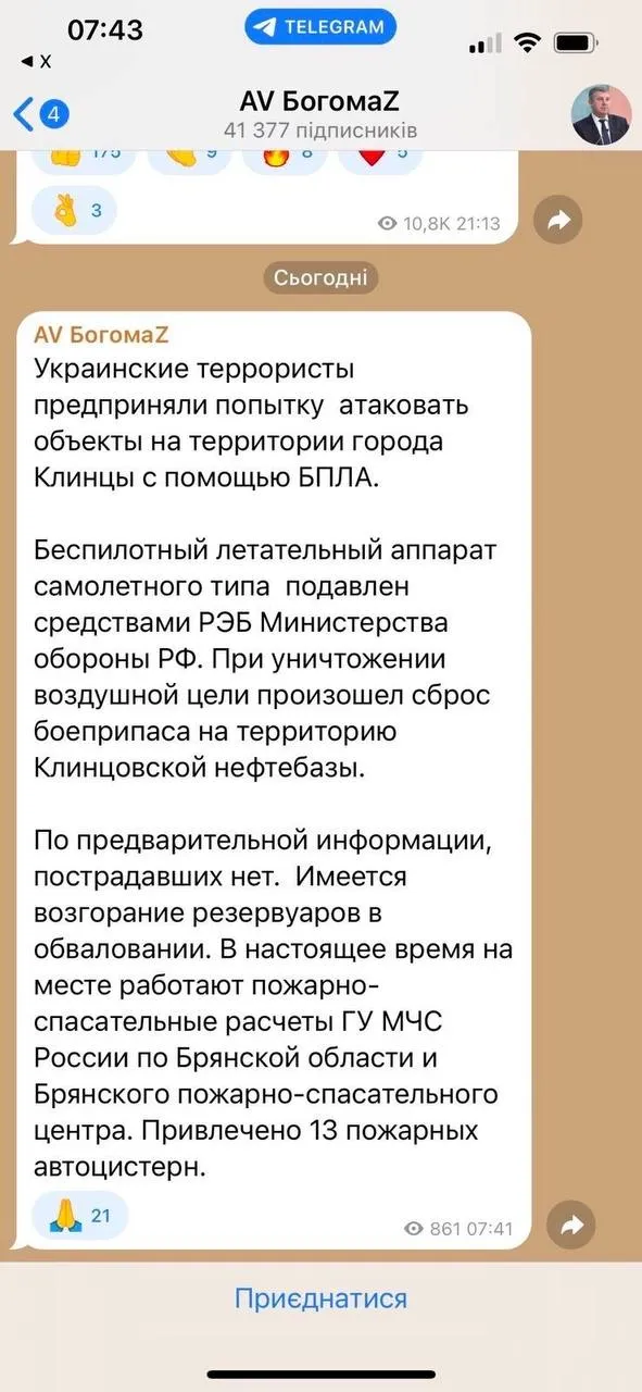 "Украинцы пытались атаковать объекты на территории города Клинцы с помощью БПЛА. Дрон был подавлен средствами РЭБ министерства обороны России. При уничтожении воздушной цели произошел сброс боеприпаса на территорию Клинцевской нефтебазы", – лихо завернул чиновник.